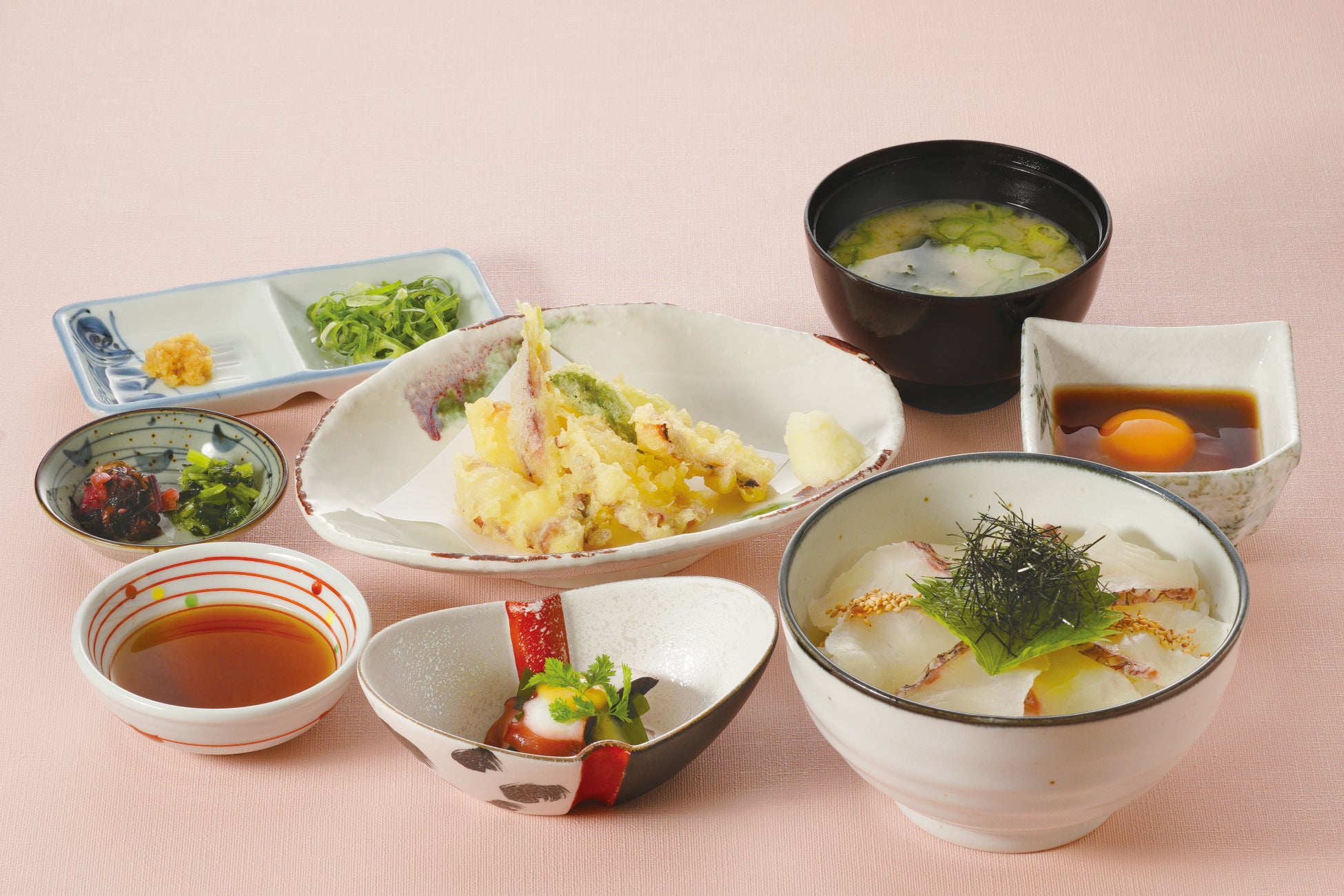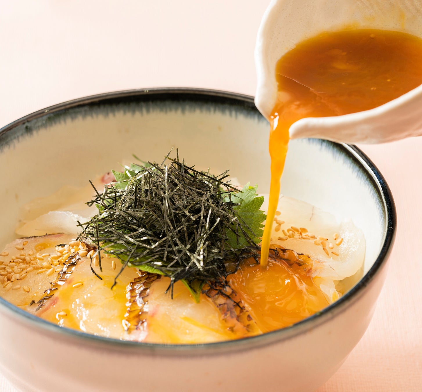 鯛は自家製の甘だれと生卵で掛け御飯にしてお召し上がりいただけます。また淡路島産の真蛸は、酢味噌和えと天麩羅に仕上げました。