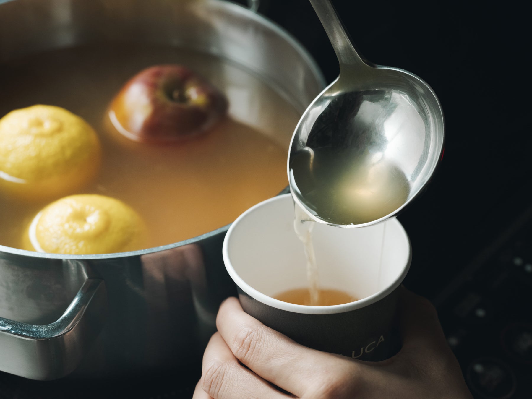 大きな鍋に旬のりんご、ゆず、ジンジャーを入れて、店内でコトコト煮込んでつくる冬においしい自家製ジュースが今年も登場です。旬の黄ゆずの風味が爽やかに広がる、果実とジンジャーのホットジュースは、毎日素材から手作りしているため、店内は心を癒すゆずの香りに包まれます。