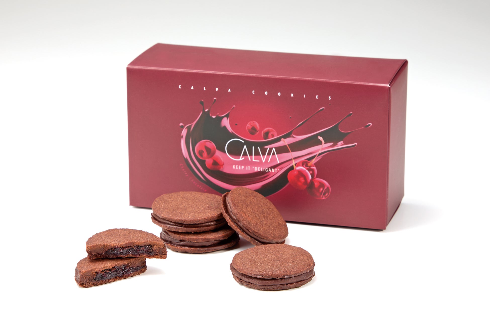 ショコラクッキーにビターガナッシュを絞り、アクセントにチェリーのコンポートジャムをしのばせたサンドクッキー。