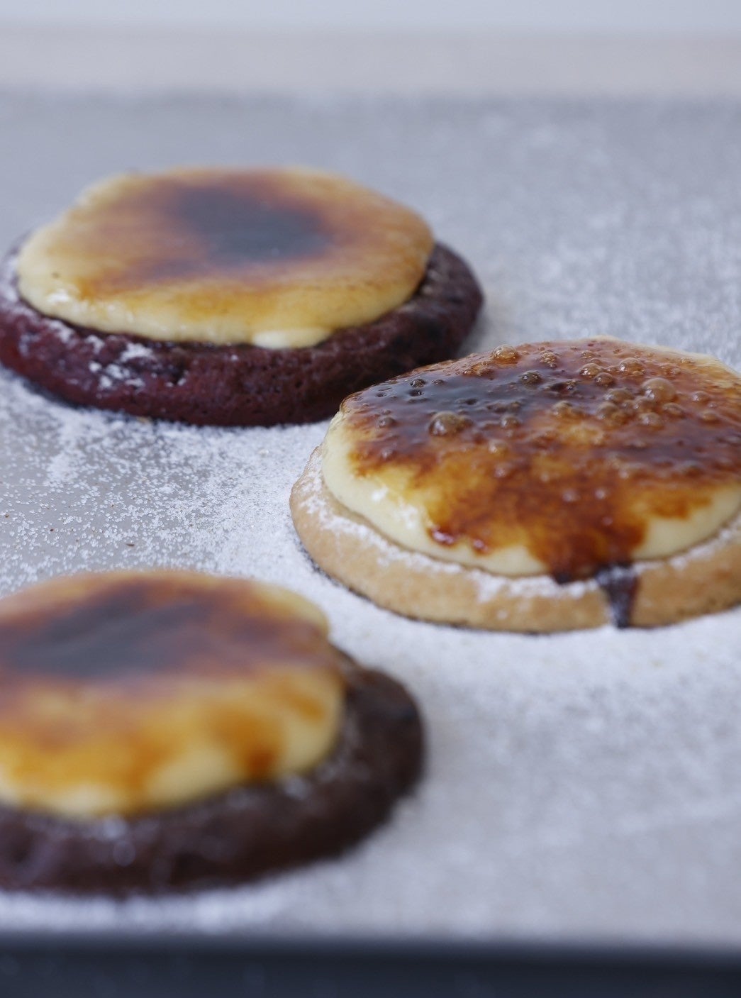 好きなクッキーにカスタードを絞り、その場でブリュレに