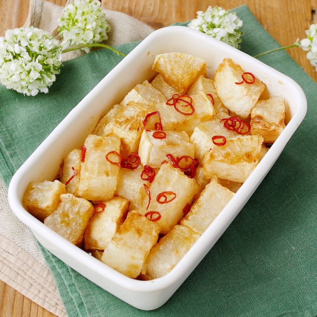 煮物やサラダで脇役になりがちな大根を、しっかり主役に引き上げた一品。揚げてから甘酢に絡めることで、淡泊な印象を覆す、ごはんが進むおかずに仕上げています。