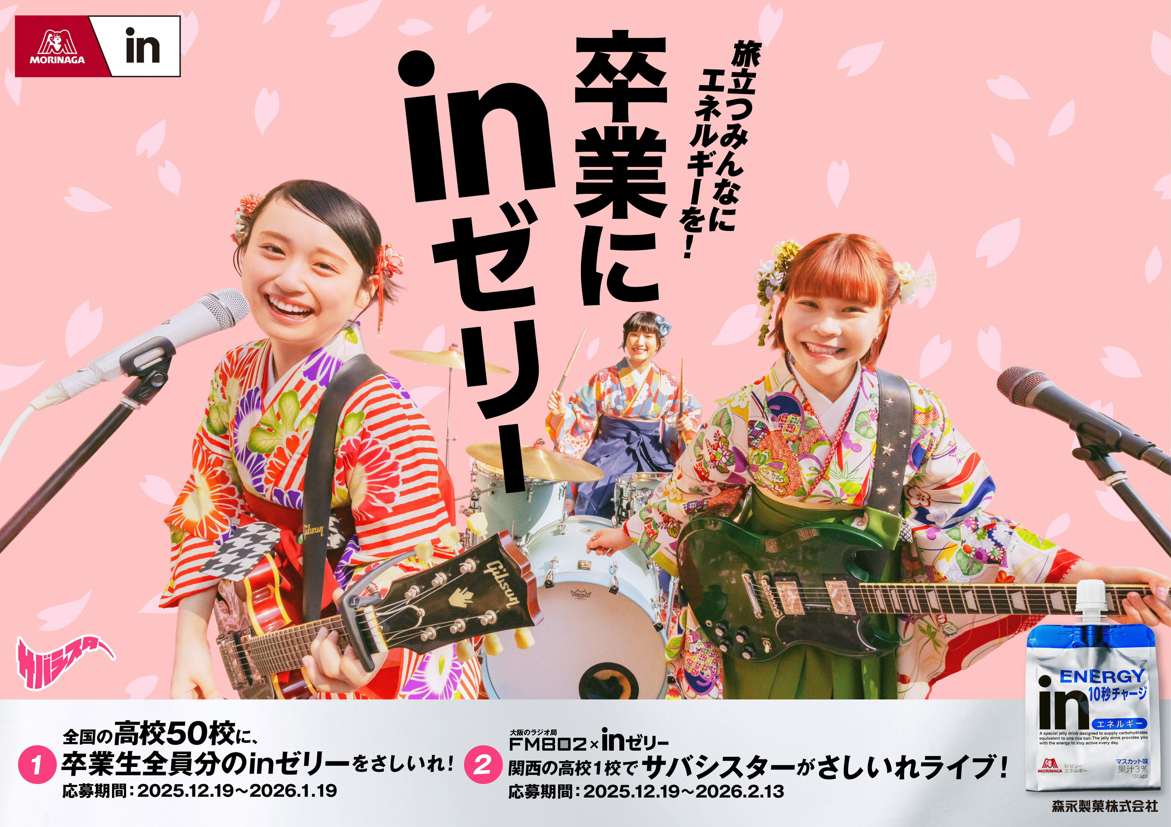 森永製菓株式会社(東京都港区芝浦、代表取締役社長 COO・森 信也)は、2026年3月に卒業を迎える学生を応援するため、「卒業にinゼリー」として2つの特別企画を実施致します。全国50校に、卒業生全員分の「inゼリー」を贈る「inゼリーさしいれキャンペーン」と、関西地区限定の「サバシスターライブさしいれキャンペーン」について2025年12月19日より募集を開始いたします。