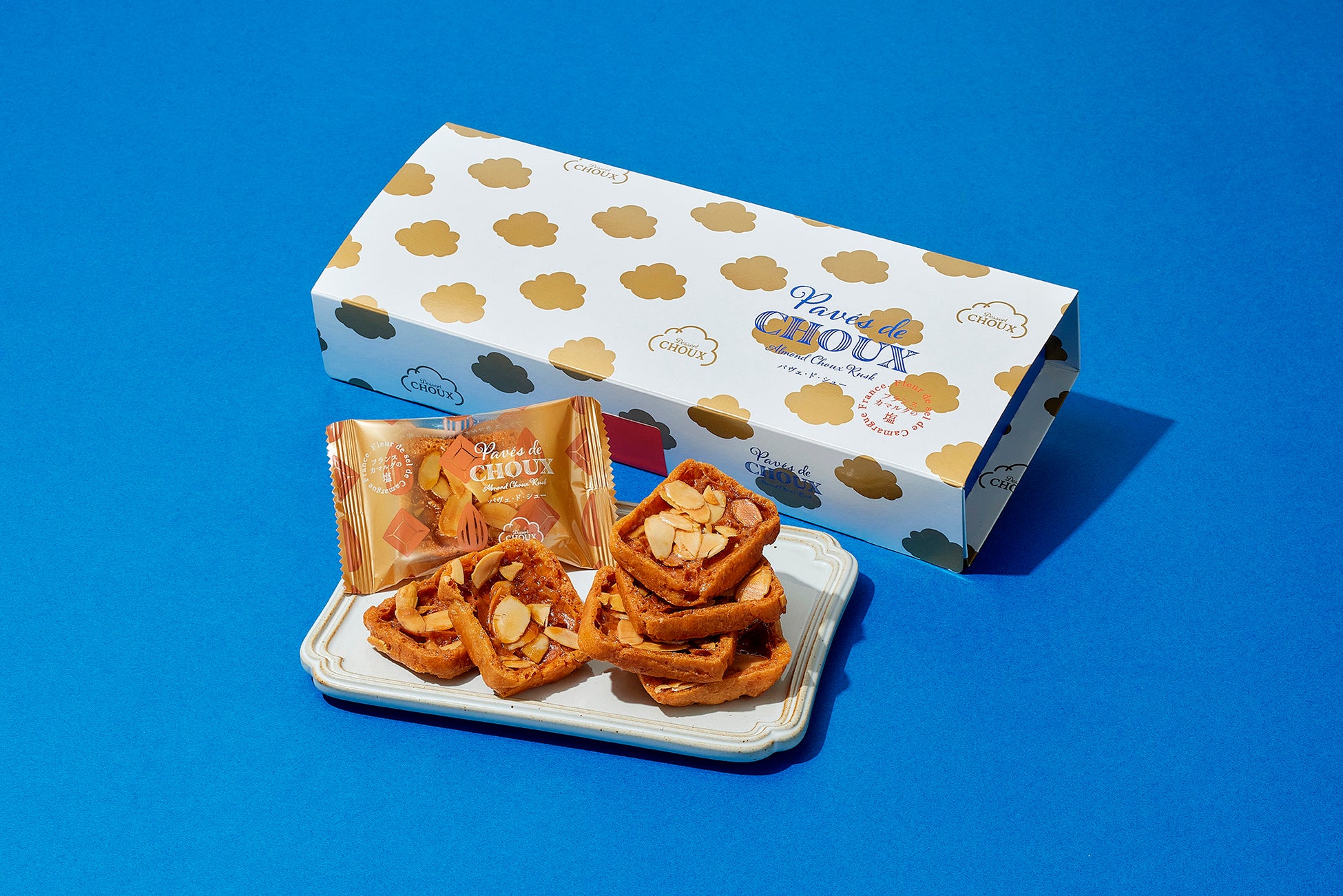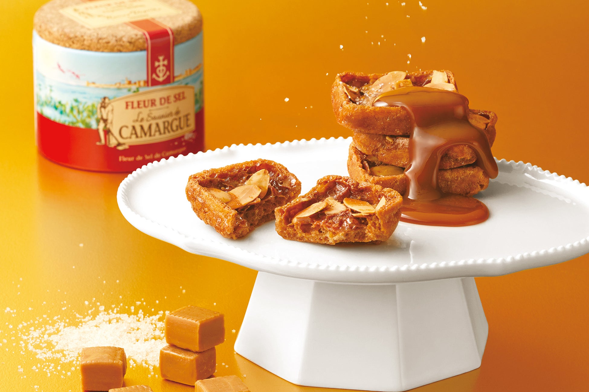 “フルール・ド・セル=塩の花”と呼ばれる南仏カマルグ産の完全天日塩を使用し、職人達が丁寧に炊き上げたキャラメルとアーモンドスライスをトッピングしたシュー皮を合わせ香ばしく焼き上げました。塩キャラメルの濃厚で深みのある味わいと、驚きのくちどけに出会える焼菓子です。