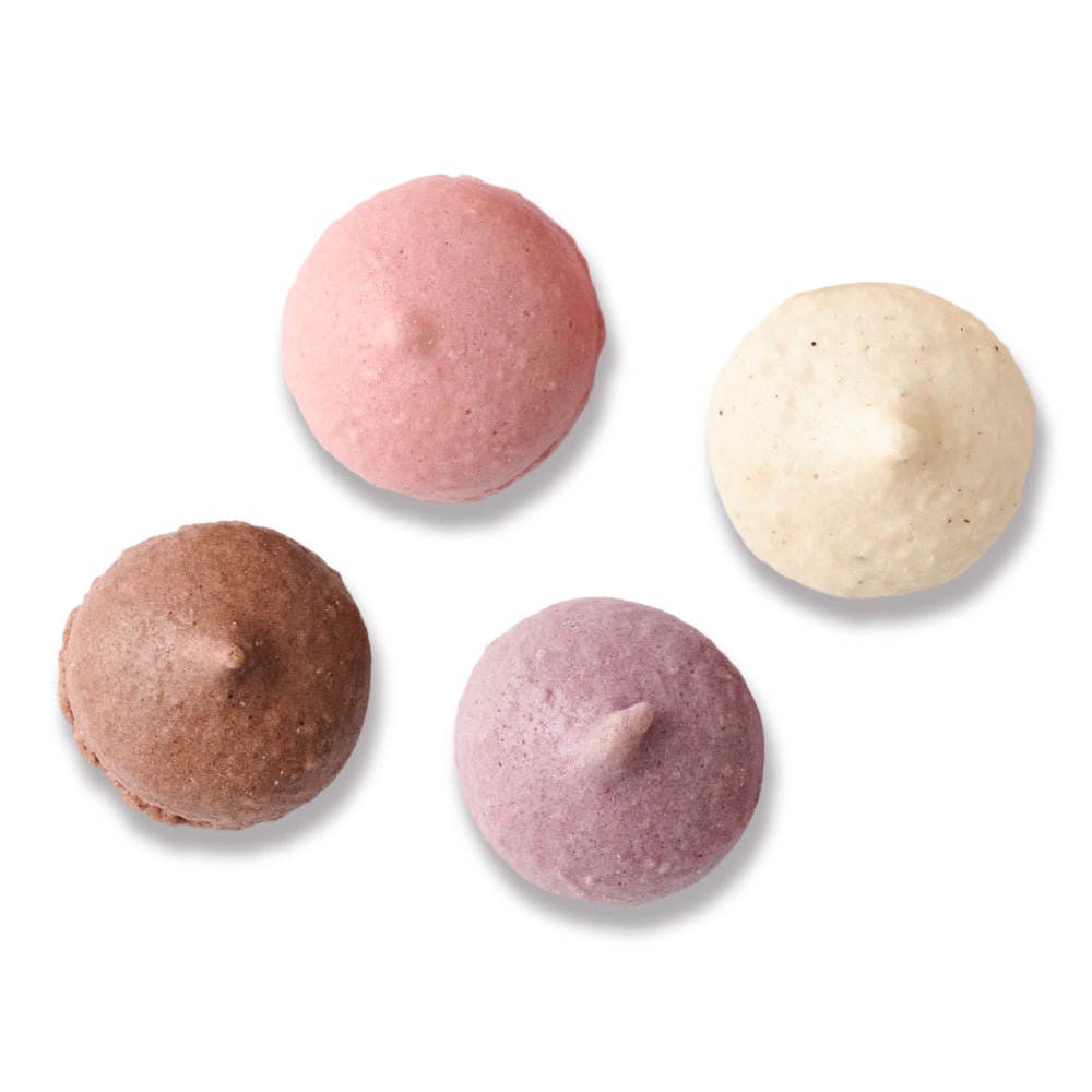 Her lip toのシグネチャーであるチェリーをテーマに、カフェタナカ グランシェフパティシエ・田中千尋氏が試作を重ねて完成させた、甘酸っぱいサワーチェリーのコンフィチュールをサントメ島産カカオの生地で挟んだ新作クッキーをはじめ、プロデューサー・小嶋陽菜が試食を重ねて選んだラベンダーはちみつのクランチ、ローズフランボワーズのマポロンなど、華やかで気品のあるクッキー5種類を詰め合わせました。