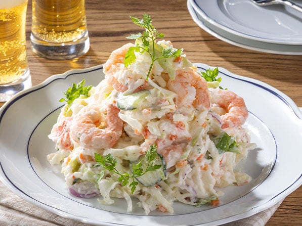 北海道産じゃがいもにキャベツ、レタス、キュウリ、オニオンなどを加えた野菜のシャキシャキ食感を愉しむポテトサラダにエビを組み合わせた食べ応え満点のサラダです。お子さまも食べやすく、ご家族でお楽しみいただけます。