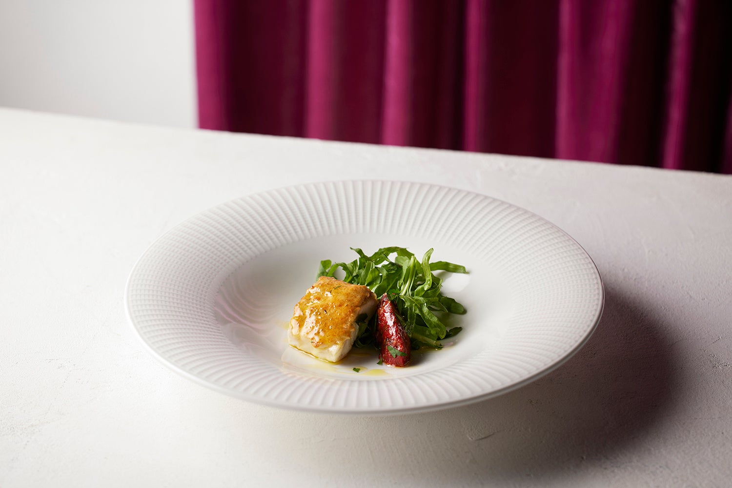 400℃のやさしい強火で焼き上げた真鯛に、イタリア シチリア島発祥の爽やかなサルサを添えてご提供。ニンニクとハーブ、レモンの香りが広がる一皿です。