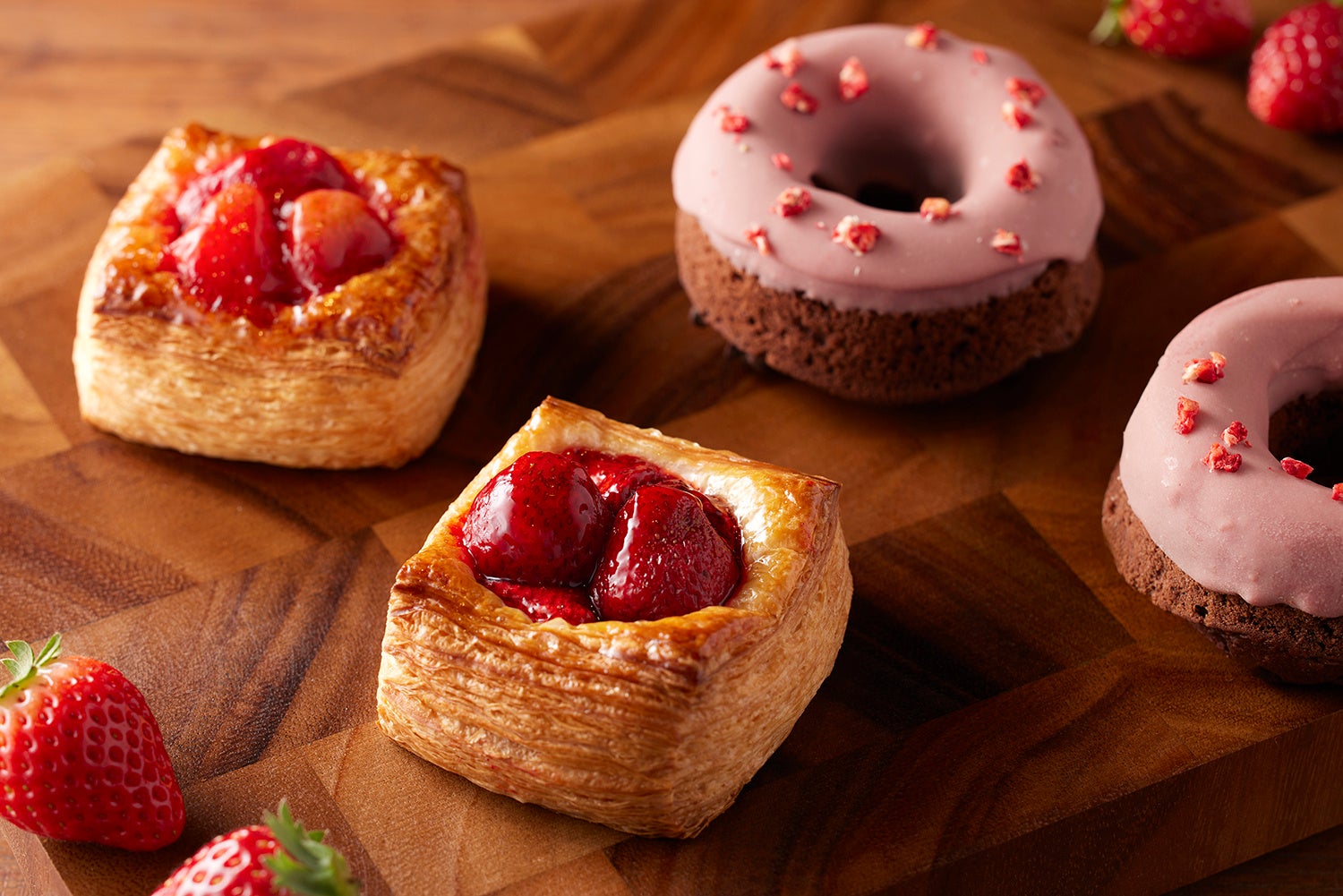 ココア風味のノンフライドーナツにいちごのチョコレートをコーティングしました。フリーズドライのいちごがアクセントに。