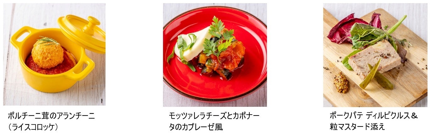 モッツァレラチーズとカポナータのカプレーゼ風、ポークパテ ディルピクルス&粒マスタード、ポルチーニ茸のアランチーニ(ライスコロッケ)