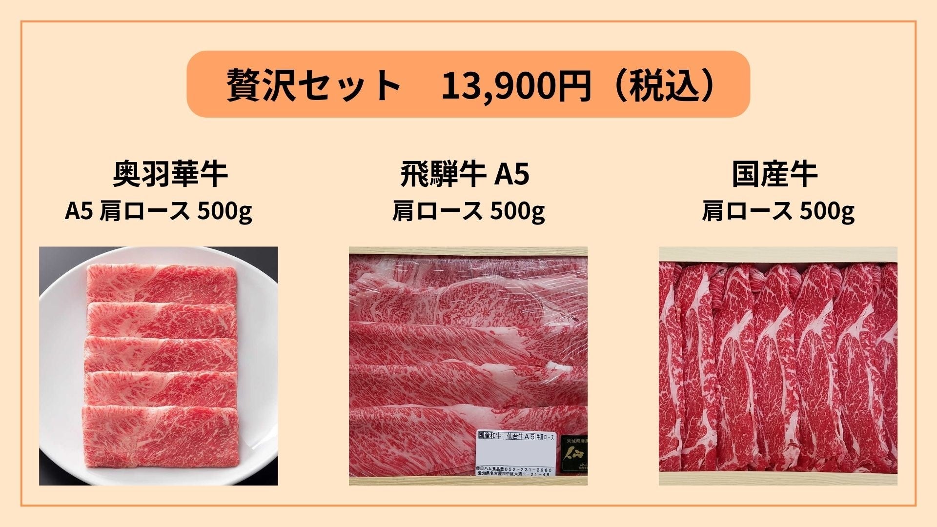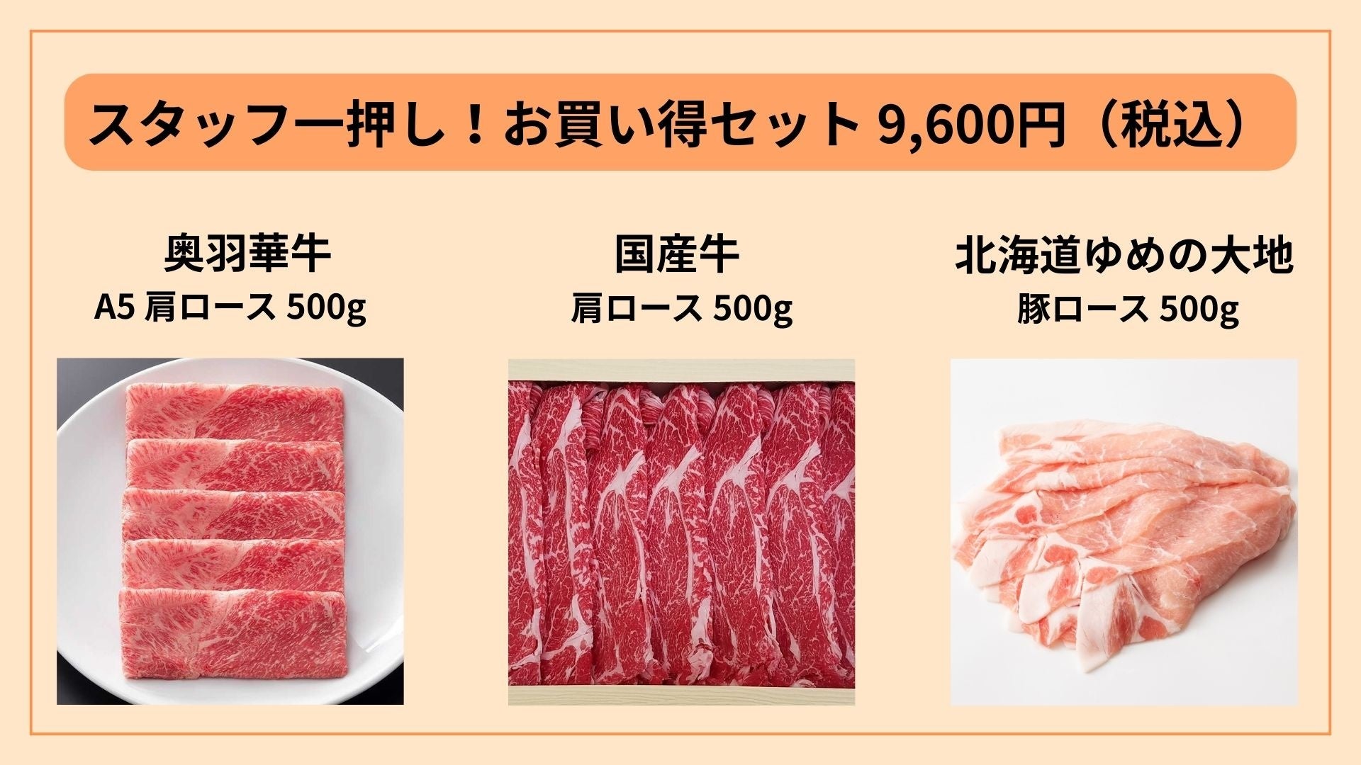 奥羽華牛 A5 肩ロース 500g 国産牛 肩ロース 500g 北海道ゆめの大地 豚ロース 500g |