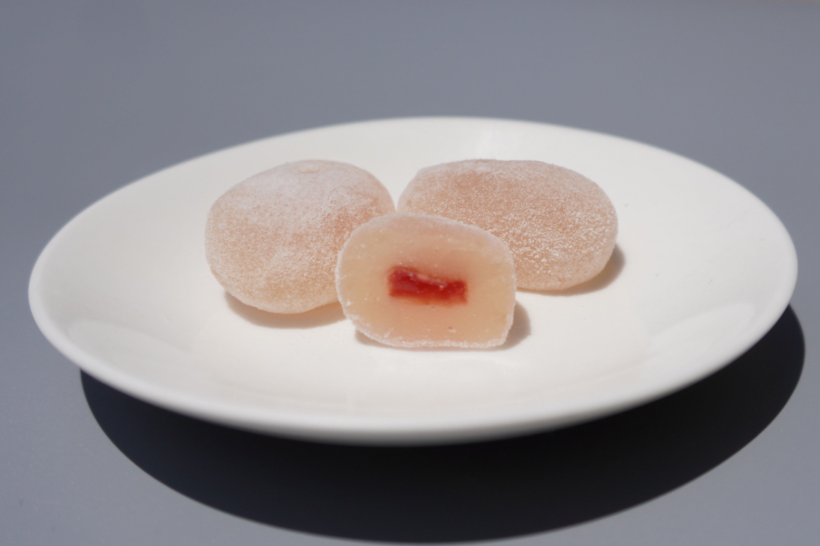 特製の果物ジャムを、柔らかな求肥で包んだ一口サイズのお餅です。羽二重餅の製法で蒸した餅粉に、水あめや砂糖を加えて練り上げた求肥で、果物のジャムをやさしく包み込んだ、なめらかで上品な味わいが特徴です。