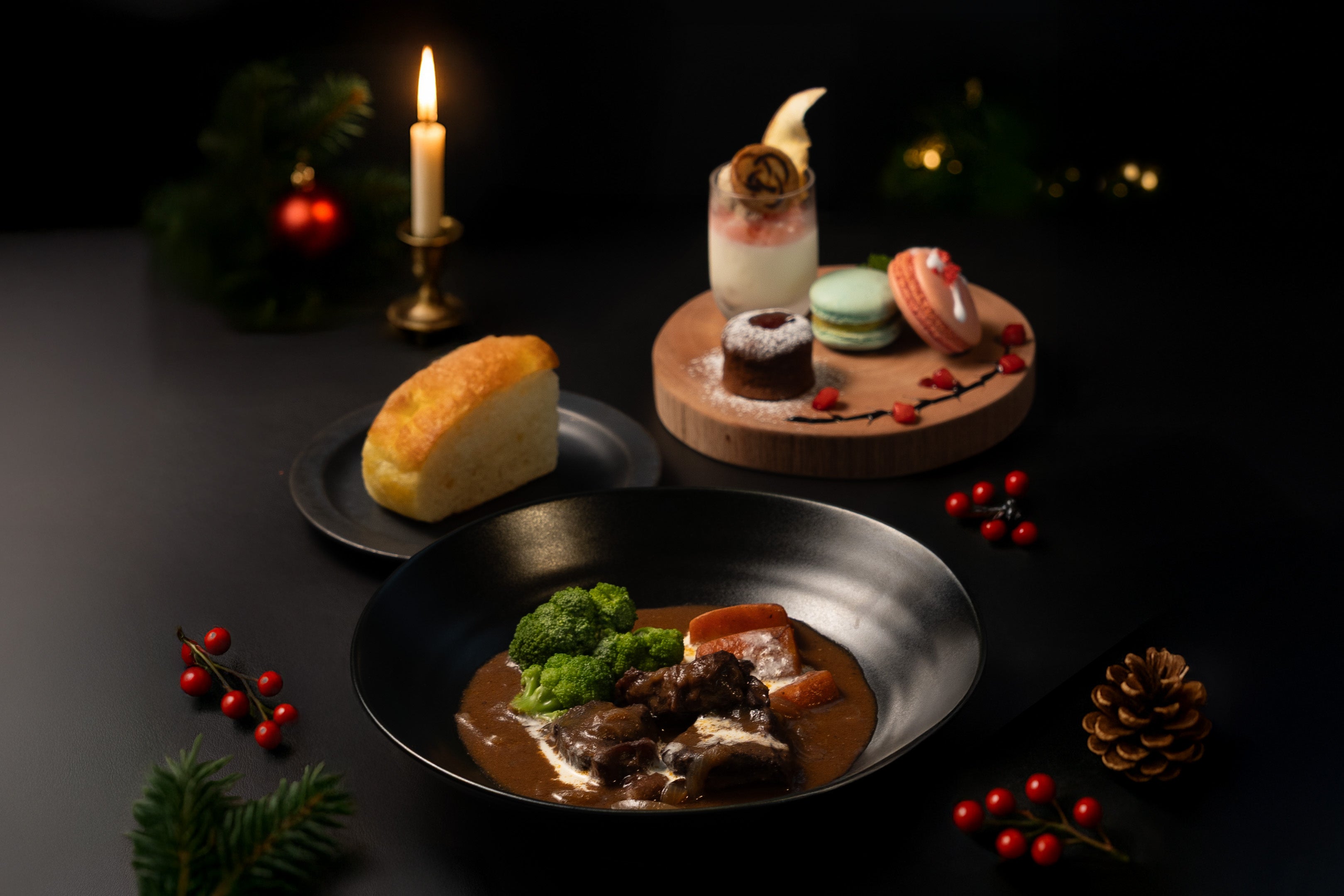 じっくり煮込んだビーフシチューに、香ばしいフォカッチャ、華やかなスイーツプレートを組み合わせた、心も身体も温まる冬だけの特別なセットです。