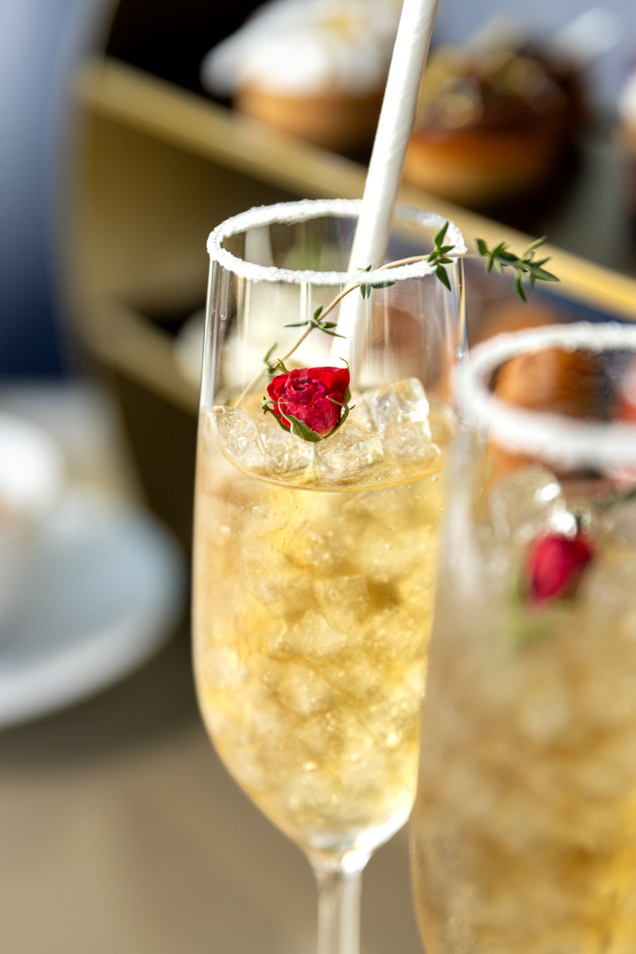ウェルカムドリンクは、カモミールをベースに、ドライジンジャーエールとはちみつを合わせ、グラスの縁にはシュガーをあしらった期間限定のスノースタイルでご提供します。