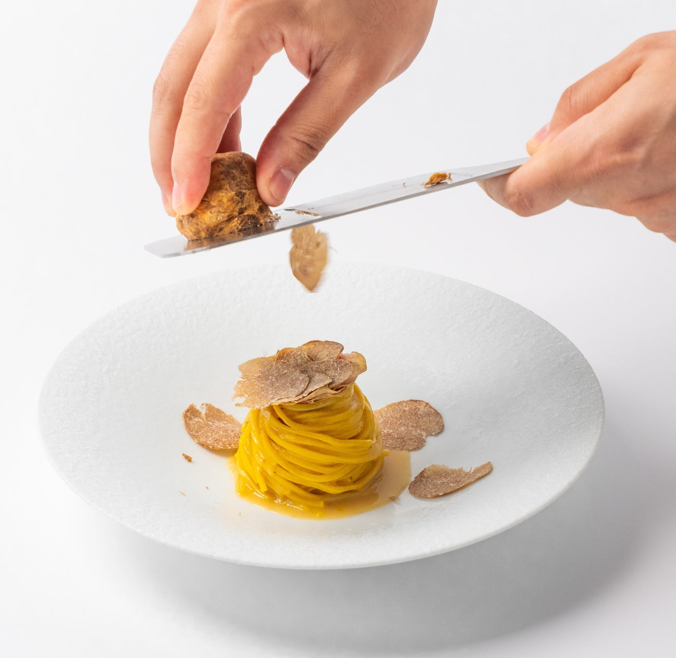 日本のオーガニック卵とイタリア産セモリナ粉を使用したフレッシュなタリオリーニには、ピエモンテ産ホワイトトリュフの香りを移したバターと仔牛のブロードを合わせ、仕上げにフレッシュトリュフをきめ細かく削り入れました。さらに、ピエモンテ産ホワイトトリュフを惜しみなくスライスし、香りの余韻まで楽しめる一皿に仕上げています。