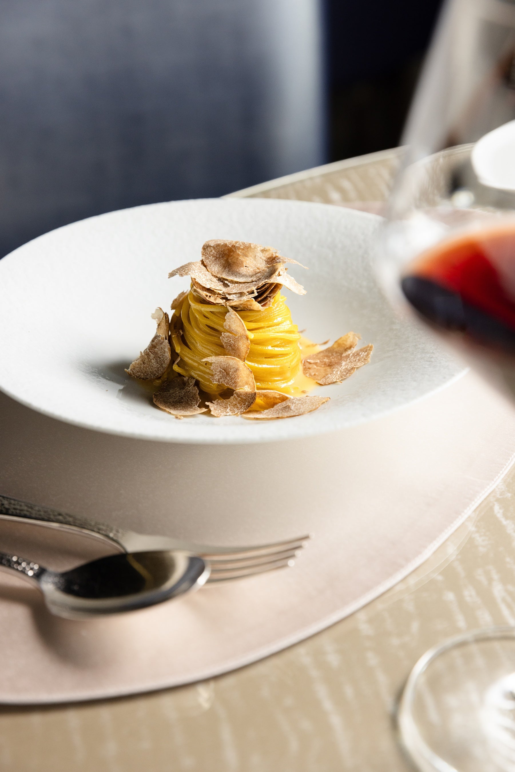 日本のオーガニック卵とイタリア産セモリナ粉を使用したフレッシュなタリオリーニには、ピエモンテ産ホワイトトリュフの香りを移したバターと仔牛のブロードを合わせ、仕上げにフレッシュトリュフをきめ細かく削り入れました。さらに、ピエモンテ産ホワイトトリュフを惜しみなくスライスし、香りの余韻まで楽しめる一皿に仕上げています。
