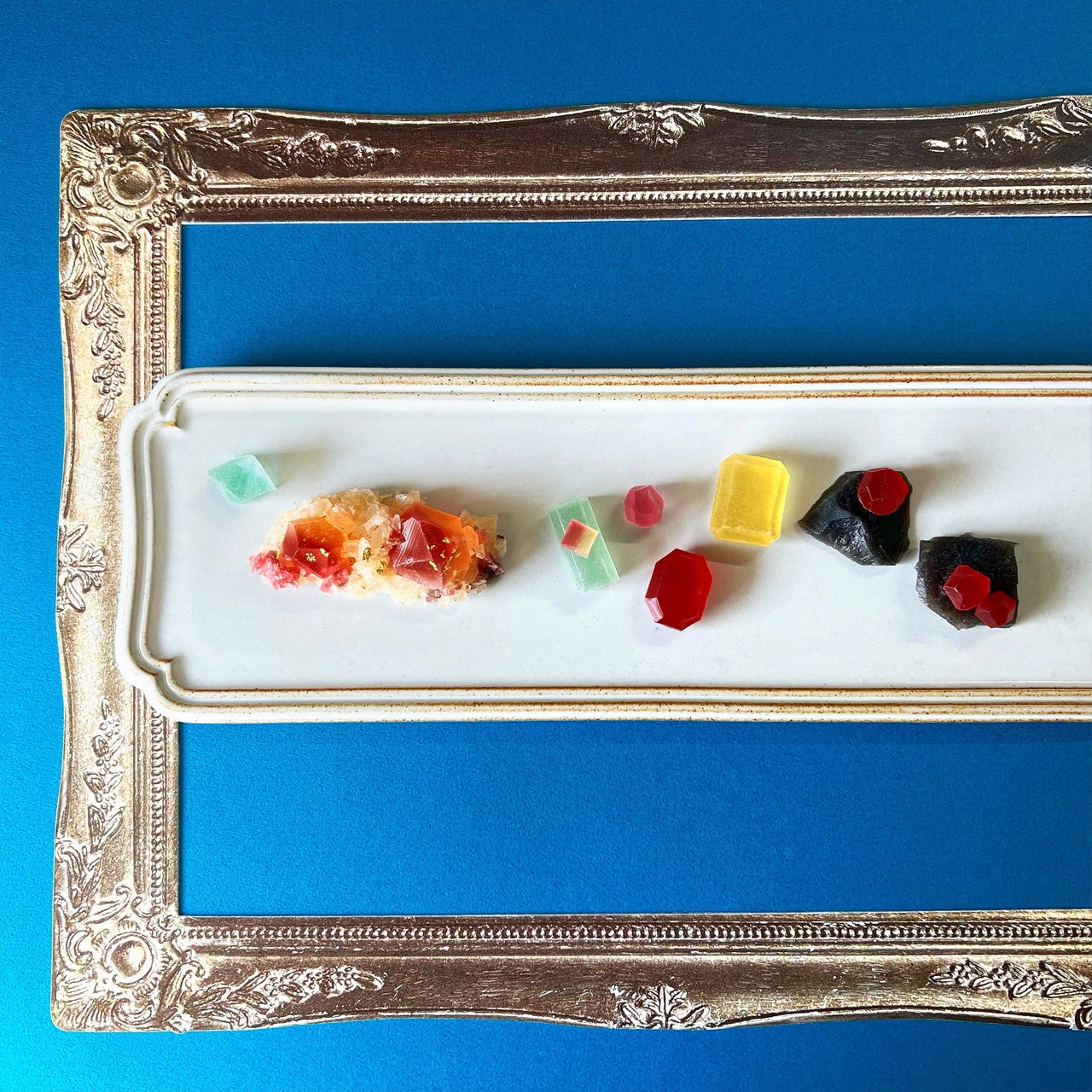 砂糖と寒天からできた和菓子の一種、琥珀糖。「こうぶつヲカシ」はこれに鉱物や宝石のイメージを加えた、アート作品のようなお菓子です。石の美しい佇まいを想像しながら、ひとつひとつ職人の手で切り出しており、どれひとつとして同じものはない唯一無二の作品が出来上がります。こうぶつヲカシという名前は、大好物と鉱物をかけ、「いとをかし」なお菓子として名づけました。