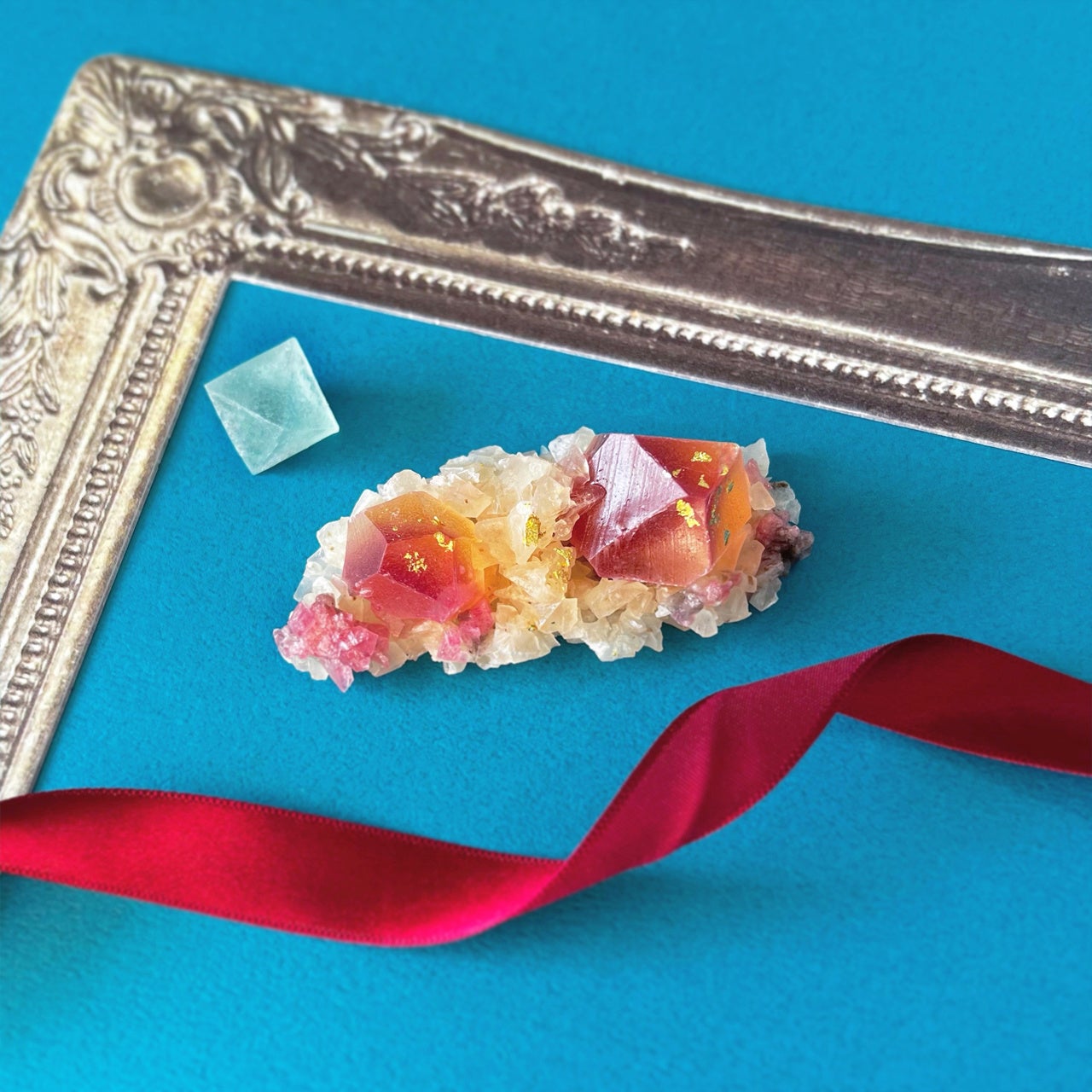 毎月一か月間だけお作りする誕生石のこうぶつヲカシ。1月の誕生石ガーネットは、深みのある赤と小さな粒がぎゅっと詰まったような原石の形から柘榴石と呼ばれています。赤色が印象的な鉱物ですが、ローズレッド、グリーン、オレンジ、イエローなど華やかな色が多く、その輝きの強さをモチーフに制作しました。ひとつひとつ職人が手作業で切り出す琥珀糖は、ひとつとして同じものはない、手仕事ならではの温かみで、鉱物や宝石の美しさを表現しています。