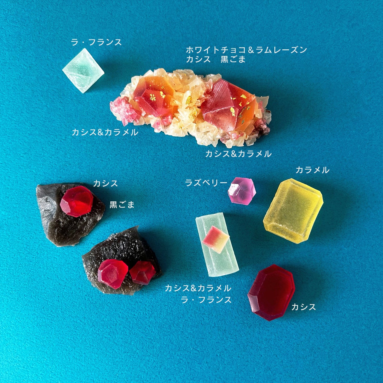 こうぶつヲカシ〈琥珀糖〉は、表面はシャリっと、中はしっとり、不思議な食感が特徴の和菓子。天然由来の色素で色とりどりに表現したこうぶつヲカシは、色によって異なる様々な味わいが楽しめます。特に、ガーネットの母岩を表現した黒は、琥珀糖には珍しい黒ゴマ味。濃厚な味わいが人気です。