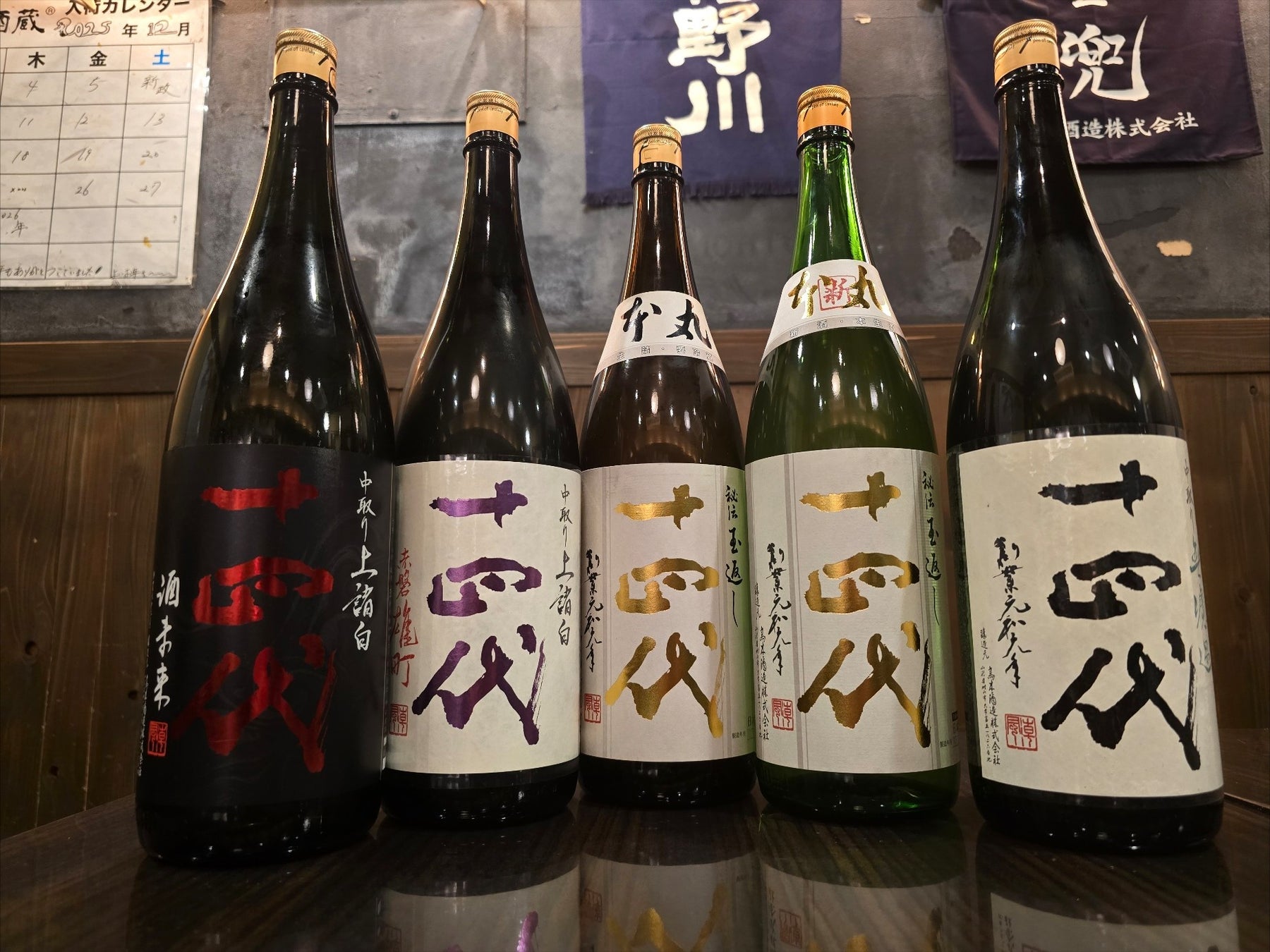 新宿東口店では、全国的に高い人気を誇り入手困難とされる「十四代」シリーズを贅沢に5種飲み比べできるプランをご用意しました。銘柄構成の異なる2種類の「十四代5種飲み比べセット付きプラン」からお選びいただけます。