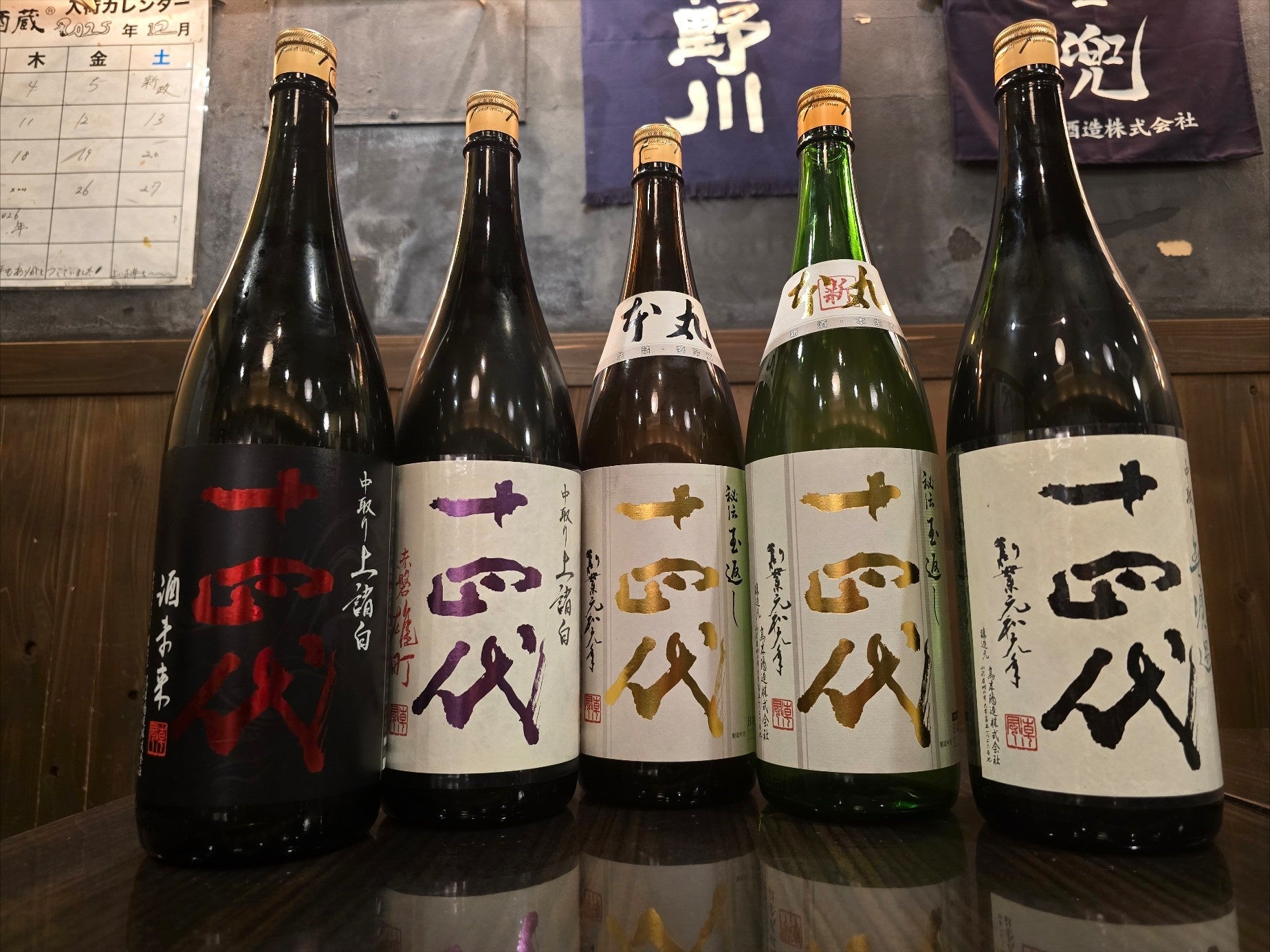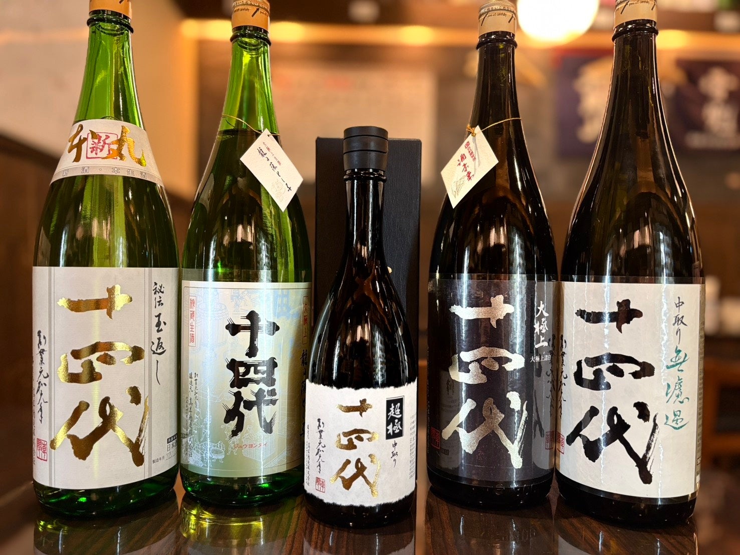 新宿東口店では、全国的に高い人気を誇り入手困難とされる「十四代」シリーズを贅沢に5種飲み比べできるプランをご用意しました。銘柄構成の異なる2種類の「十四代5種飲み比べセット付きプラン」からお選びいただけます。