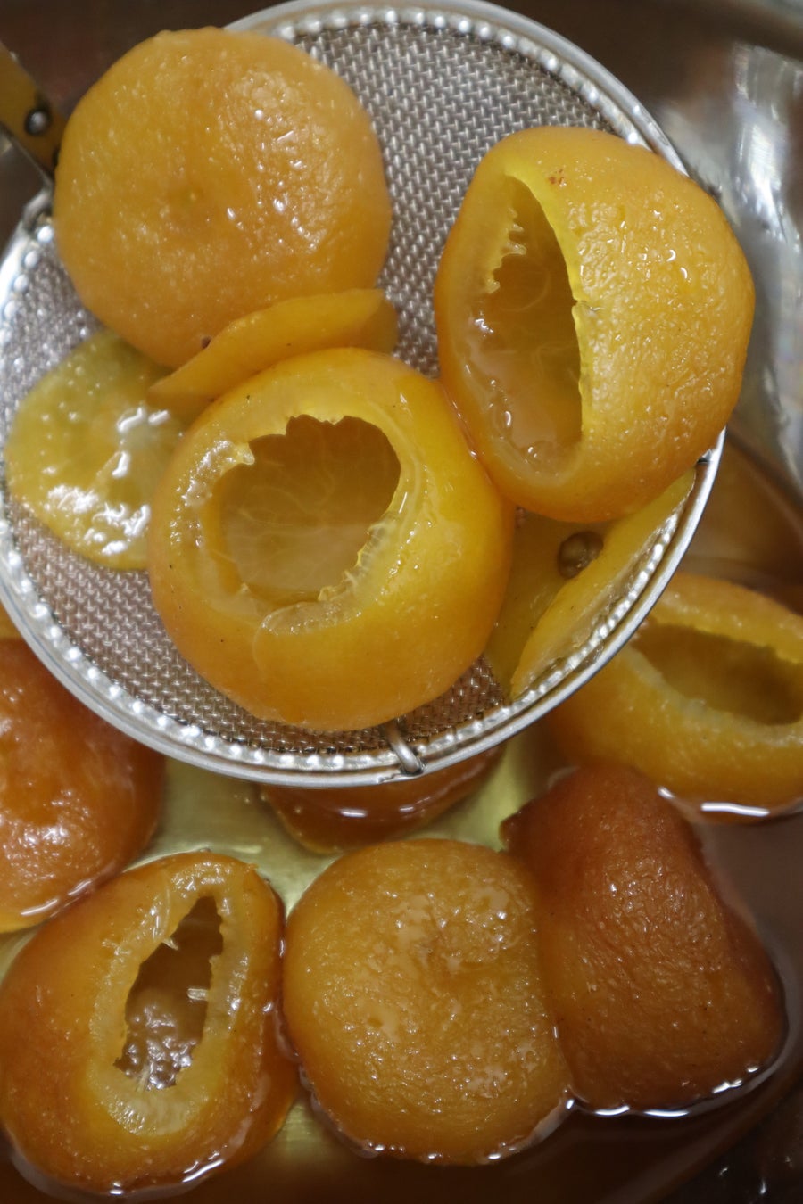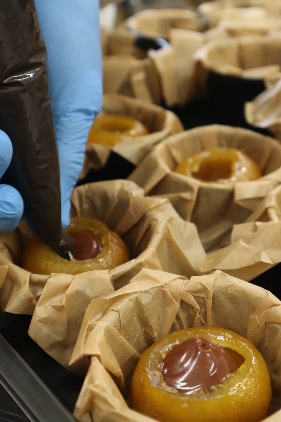 一つひとつ丁寧に中身をくり抜いた柚子を蜜漬けし、器として使用。