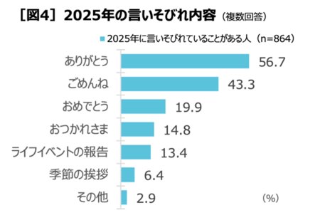 2025 年に言いそびれていることがある 864 人に言いそびれの内容を聞くと、「ありがとう」( 56.7 %)や「ごめんね」( 43.3 %)が多く、具体的には「友人に結婚おめでとうと言えなかった」(女性 20 代)、「帰省した際、母親が腕によりをかけて作ってくれた料理においしかったよと言いそびれてしまった」(男性 40 代)など、さまざまない言いそびれが寄せられました[図 4 ]。