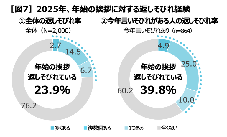 2025年、年始の挨拶を返しそびれている人は23.9%(多くある2.7%+複数個ある14.5%+1つある6.7%)。「今年言いそびれがある」と回答した人の中では、返しそびれ率は39.8%(多くある 4.9%+複数個ある25.0%+1つある10.0%)に達しました[図7]。