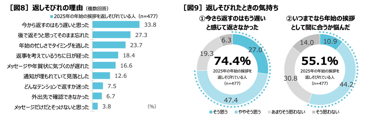 2025年の年始の挨拶を返しそびれている477人に理由を聞くと、「今から返すのはもう遅いと思った」(33.8%)、「後で返そうと思っていたらそのまま忘れた」(27.3%)、「年始の忙しさでタイミングを逃した」(23.7%)が上位に挙げられました[図8]。返しそびれたときの気持ちを聞くと、「今さら返すのはもう遅いと感じて返さなかった」(74.4%=そう思う27.0%+ややそう思う47.4%)、「いつまでなら年始の挨拶として間に合うか悩んだ」(55.1%=そう思う10.9%+ややそう思う44.2%)など返すタイミングを悩むうちに返せなくなるケースが多いようです[図9]。