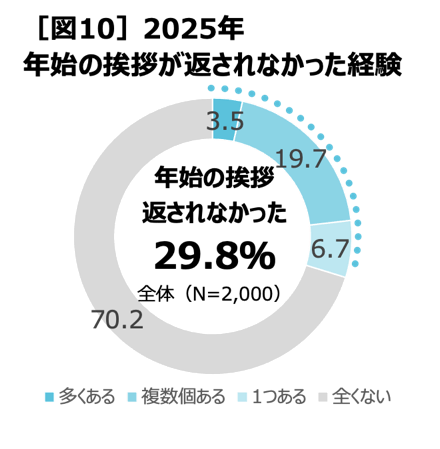 2025年に年始の挨拶を送ったが返事を受け取れなかった人は、全体の29.8%(多くある3.5%+複数個ある19.7%+1つある6.7%)でした[図10]。
