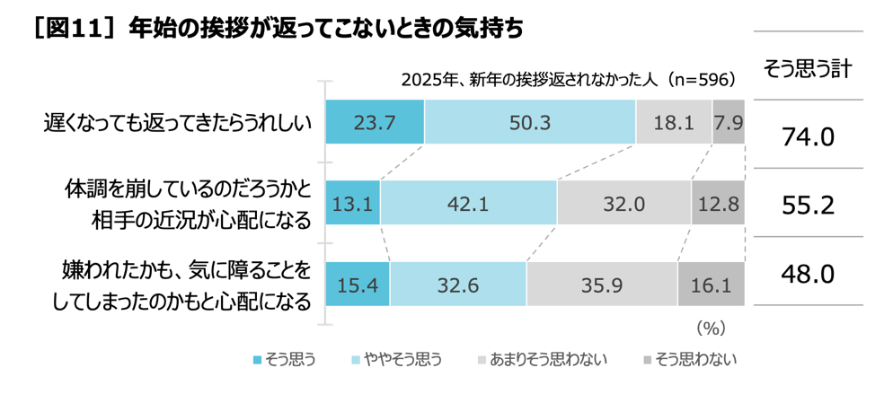 2025年に年始の挨拶を送ったが返事を受け取れなかった596人に返事がないときの気持ちを聞くと、74.0%(そう思う23.7%+ややそう思う50.3%)が「遅くなっても返ってきたらうれしい」と答え、約半数が「体調を崩しているのだろうかと相手の近況が心配になる」(55.2%=そう思う13.1%+ややそう思う42.1%)と相手のことを気遣っています。また、「嫌われたかも、気に障ることをしてしまったのかもと心配になる」(48.0%=そう思う15.4%+ややそう思う32.6%)と答えた人も少なくなく、挨拶を返さないことで誤解が生じ、人間関係をこじらせてしまう、そんなケースもありそうです[図11]。