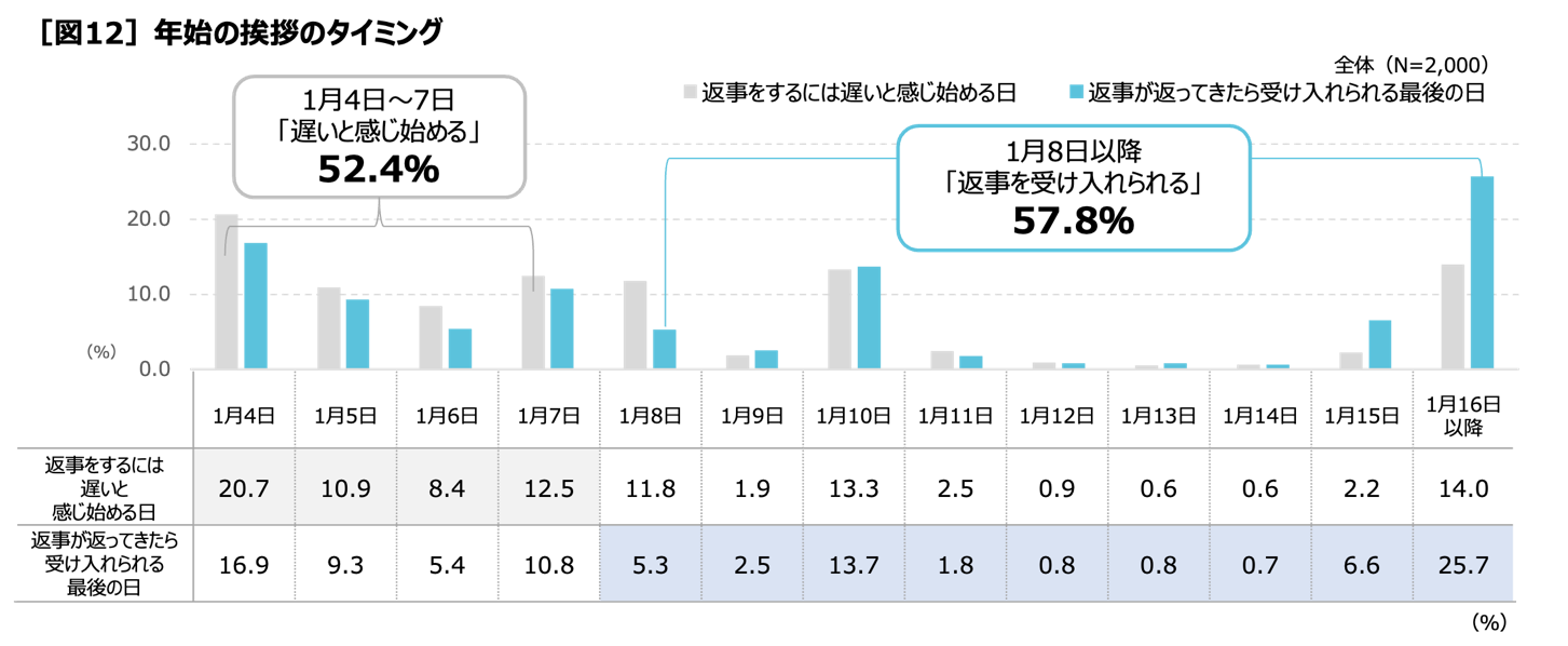 また、「あけおめ」の返事のタイミングについて、送る側(返事をする側)は1月4日から7日までに「遅いと感じ始める」人が52.4%。松の内には間に合っているのに、約半数が「返事をするにはもう遅い」と感じています。一方、受け取る側(返事をもらう側)は、松の内終了後の1月8日以降も「受け入れられる」と57.8%が答えており、送る側と受け取る側に意識の差が生じています[図12]。年始の挨拶を「松の内」に済ますという慣習にとらわれない、「新・松の内」ともいえる期間が1月8日以降に存在するといえそうです。