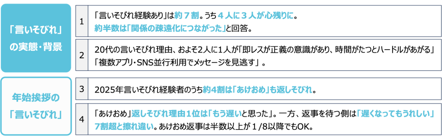「言いそびれやコミュニケーションについての実態調査」 感謝・おわび・季節の挨拶など「言いそびれ」が人間関係を変える? 約7割が経験、約半数は『疎遠に…』 年賀状など年始の“あけおめ(明けましておめでとう)”言いそびれはしっかり清算を! 7割超は『(あけおめの返信は)遅れてもうれしい』と回答 ― 年明けに広がる“新・松の内”が明らかに