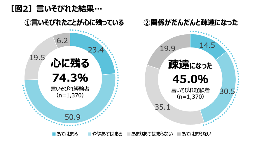これまでに言いそびれた経験があるかと聞くと、全体の68.5%(多く思い当たる25.0%+数回思い当たる39.5%+1回思い当たる4.1%)が言いそびれています[図1]。これまでに言いそびれ経験がある1,370人に言いそびれたことで起きたことを聞くと、74.3%(あてはまる23.4%+ややあてはまる50.9%)が「言いそびれたことが心に残っている」と答え、45.0%(あてはまる14.5%+ややあてはまる30.5%)が「関係がだんだんと疎遠になった」と答えました[図2]。
