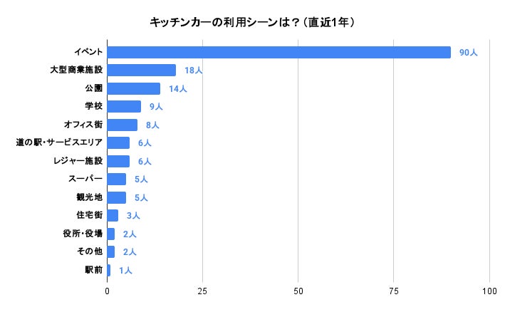 キッチンカーは、日常のランチタイムで利用されるよりも、イベント会場などの「非日常」的な空間で利用されることが圧倒的に多いようです。
