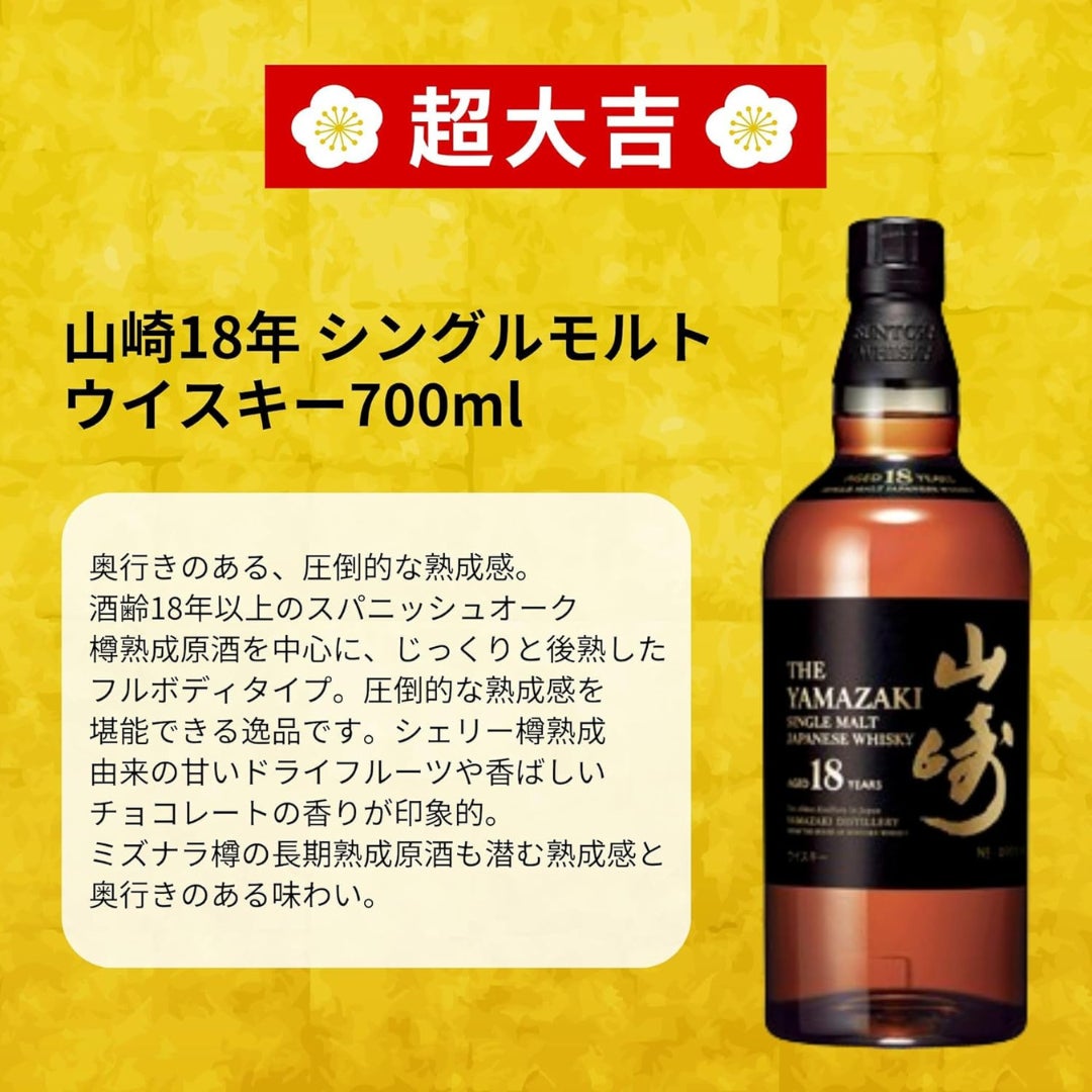 1等の超大吉は「シングルモルトウイスキー山崎18年」。メーカー希望小売価格「6万500円」のウイスキーが当たる可能性のある企画となっている。