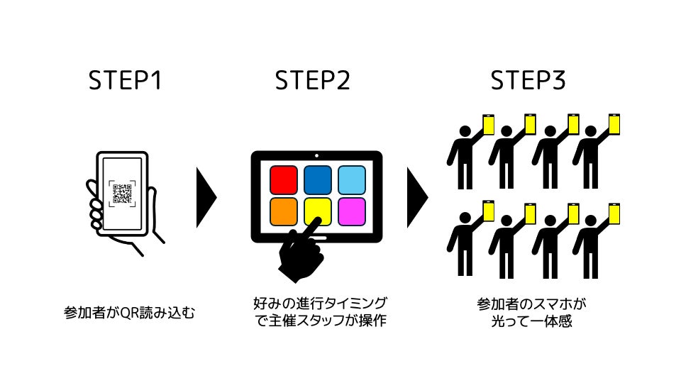 スマートフォンだけで、全員が同じ演出に参加できる仕組み