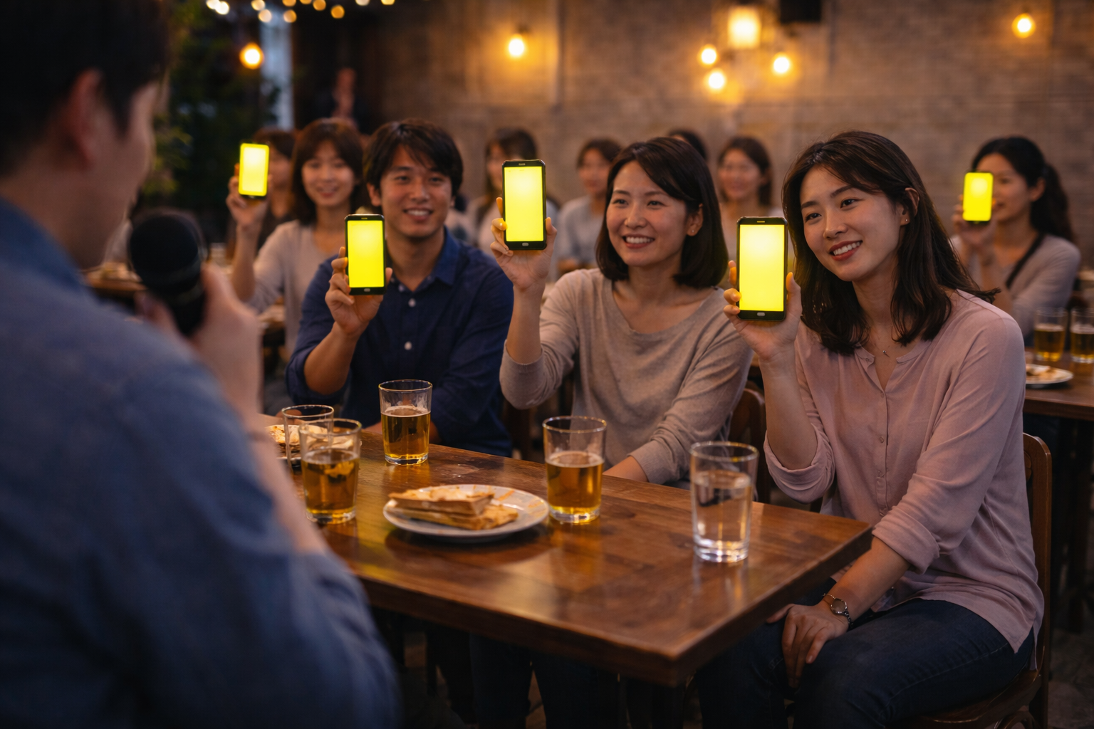 専用機材や事前準備を必要とせず、運営側が進行の要所で使うだけで、「今、この場は動いている」と判断でき、進行に迷いが生じにくい状態をつくる仕組みとして、その場にいる全員が、同じタイミングで視覚的な演出を共有できます。