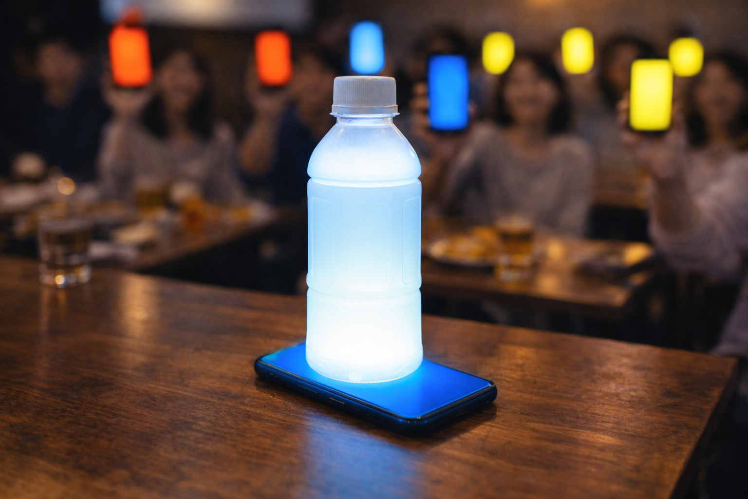 なお、スマートフォンの上にスポーツドリンクのような白濁した飲料のペットボトルを乗せることで、光がやわらかく広がり、ちょっとした参加型イルミネーションとして演出することも可能です。