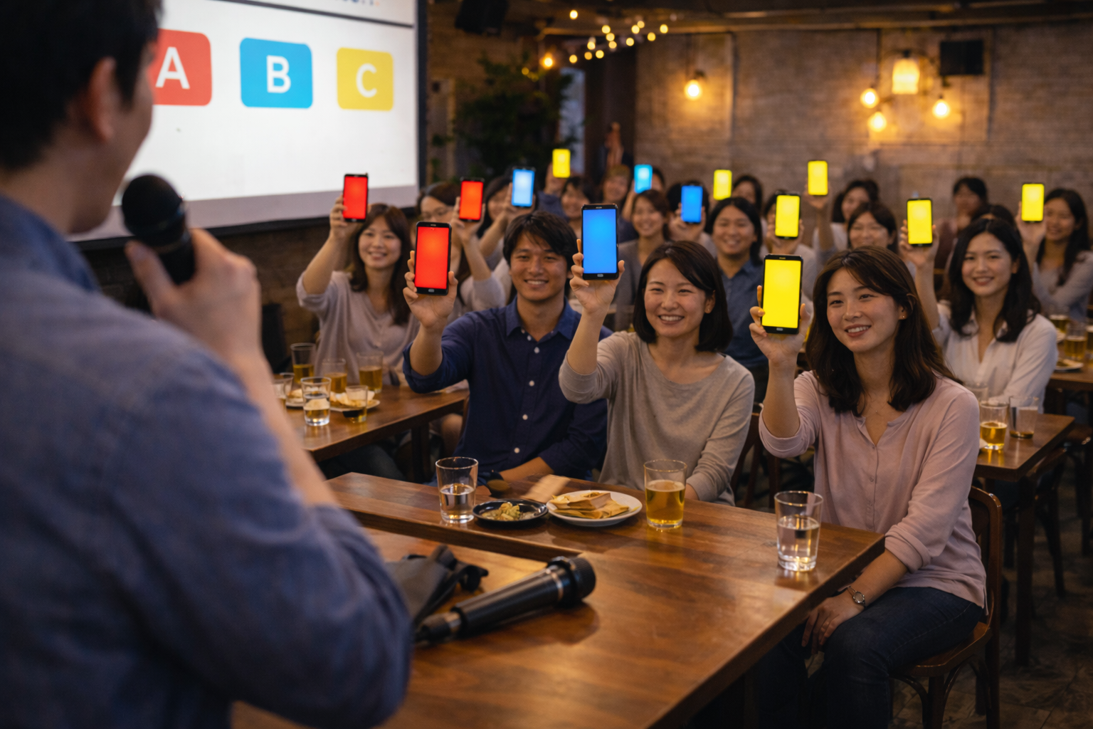 参加者一人ひとりの反応を、運営側が意図したタイミングで“揃えて可視化できる”点が特長です。