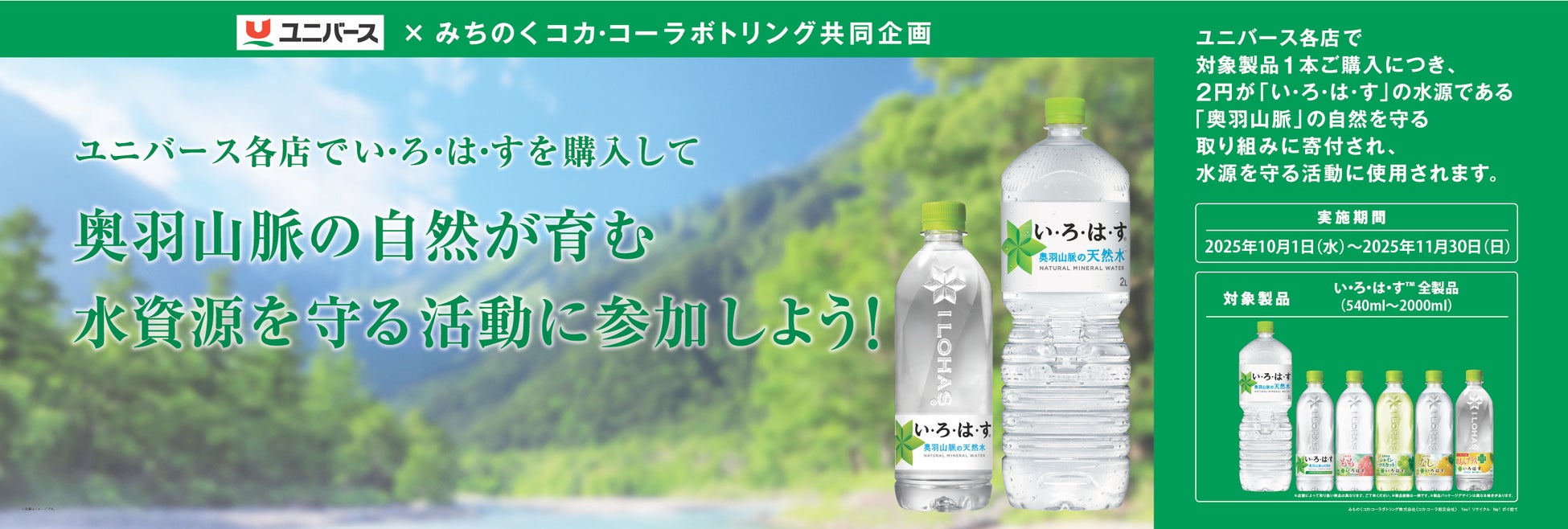 このキャンペーンは、2025年10月1日(水)から11月30日(日)までの期間、ユニバース59店舗において展開し、期間中の対象製品1本ご購入につき2円が豊沢川土地改良区へ寄付され、「い・ろ・は・す」の水源を守るための環境保全活動などに役立てられるものです。このたびの対象製品は「い・ろ・は・す」ブランド 540mlおよび2LPET 全6品目とし、売上本数は240,619本、寄付金額は481,238円となりました。なお、2018年から開始したこの取り組みによる寄付金の総額は、このたびのものを含め3,817,784円となります。