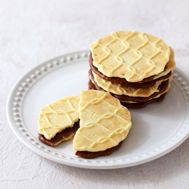 サクサク食感が人気のワッフルクッキー2種類をご用意しました。「焦がしバター」は北海道産バターミルクパウダーを配合したキャンディーをかけ、表面をキャラメリゼ。「チョコ」は蜂蜜風味のワッフルクッキー生地でミルク風味のチョコがけクッキーをサンドしました。どちらもギフト包装と手提げ袋付きで、そのまま手土産としてお渡しいただけます。