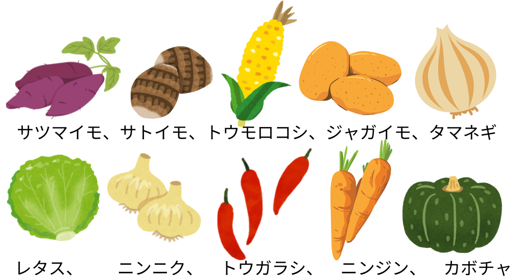 サツマイモ、サトイモ、トウモロコシ、ジャガイモ、タマネギ、レタス、ニンニク、トウガラシ、ニンジン、カボチャでも、ご利用いただいております。