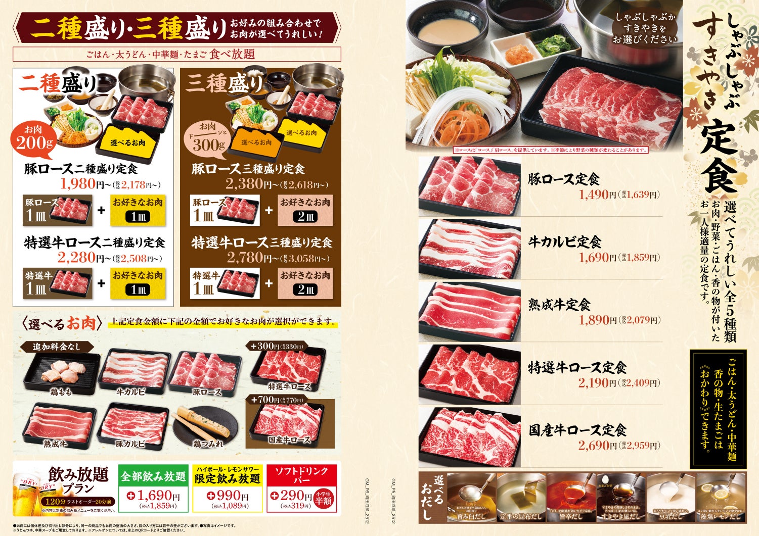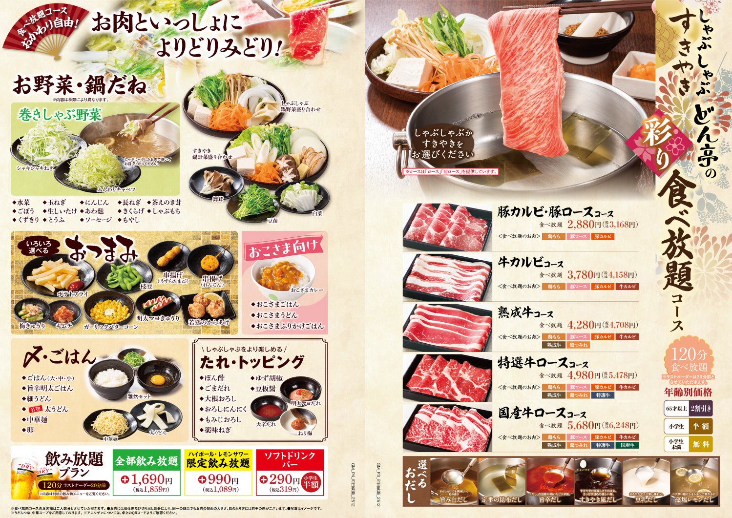 しゃぶしゃぶ・すき焼きのバラエティー豊かな食べ放題をはじめ、ごはん・どん亭名物の太うどん・中華麺がお替り自由な定食メニュー。さらにお得なランチメニュー(~16:00まで)も販売いたします。