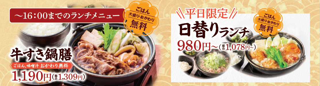 しゃぶしゃぶ・すき焼きのバラエティー豊かな食べ放題をはじめ、ごはん・どん亭名物の太うどん・中華麺がお替り自由な定食メニュー。さらにお得なランチメニュー(~16:00まで)も販売いたします。