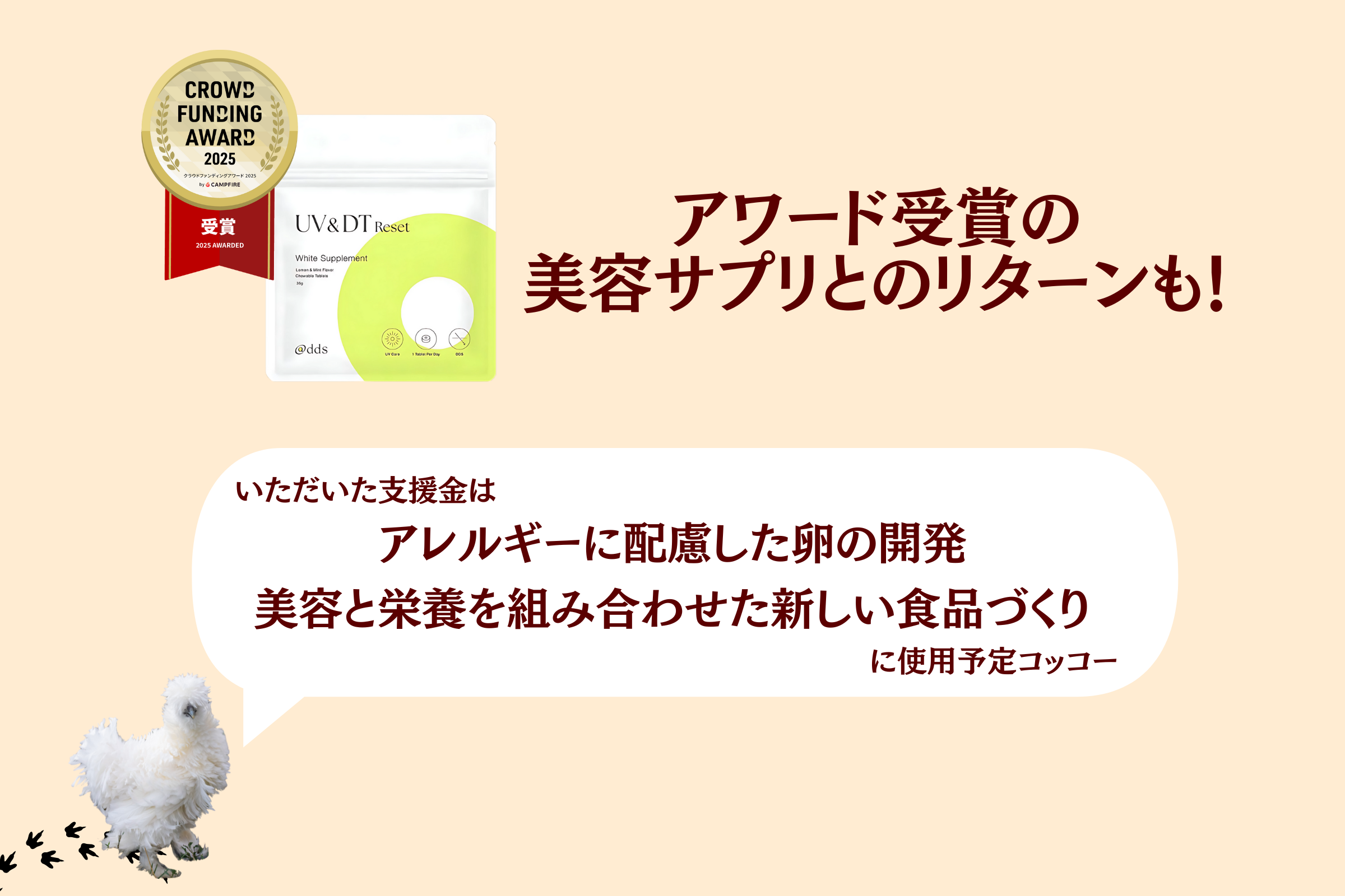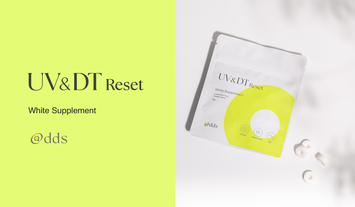 前回のクラウドファンディングで目標達成率4156%とたくさんの支援をいただいた「UV&DTリセットホワイトサプリメント」を、今回のクラウドファンディングでもエルメランとの限定セットリターンとしてご提供します。