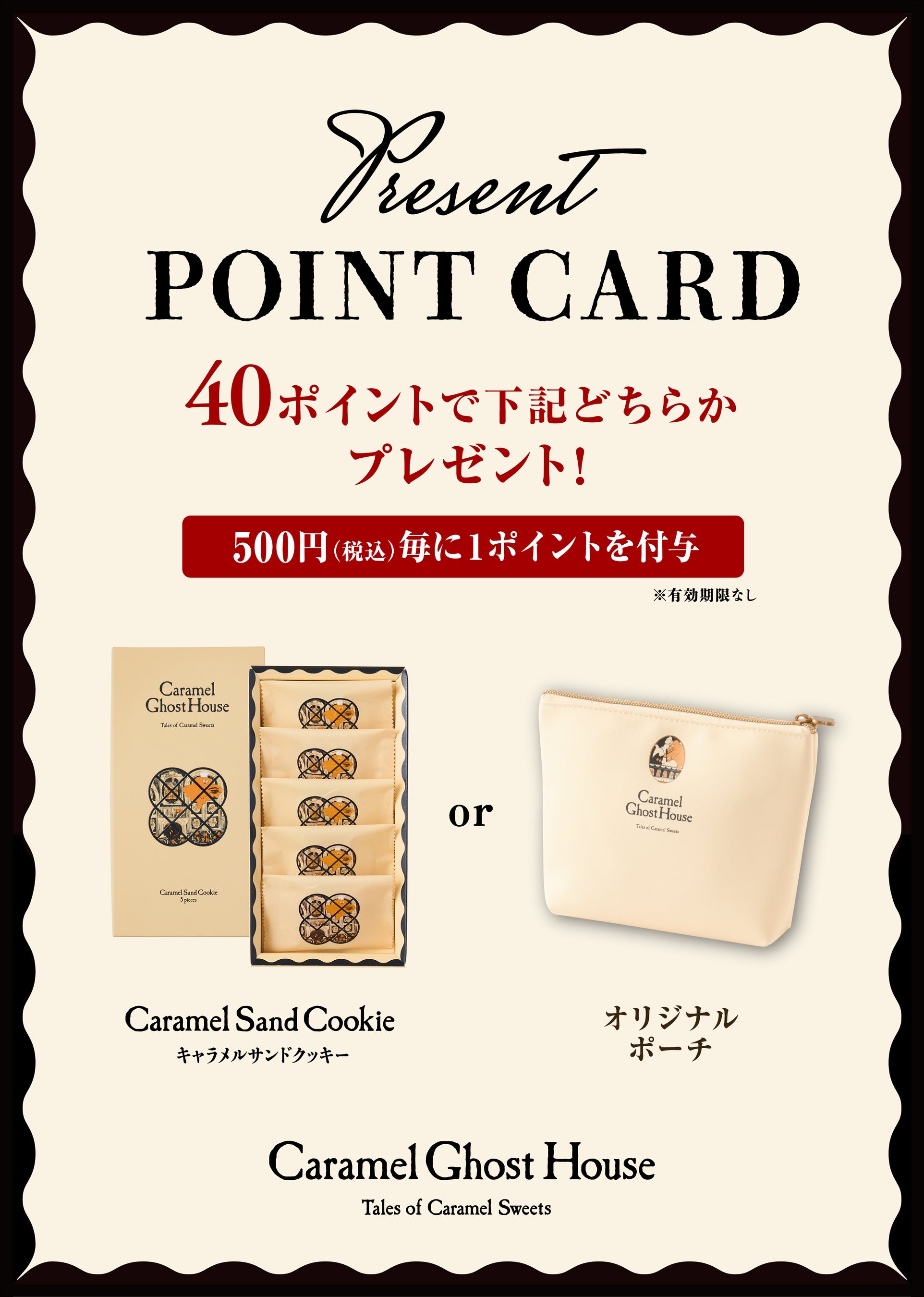 40ポイント貯まると、看板商品の「キャラメルサンドクッキー(5個入)」または「オリジナルポーチ」のいずれかをプレゼント。