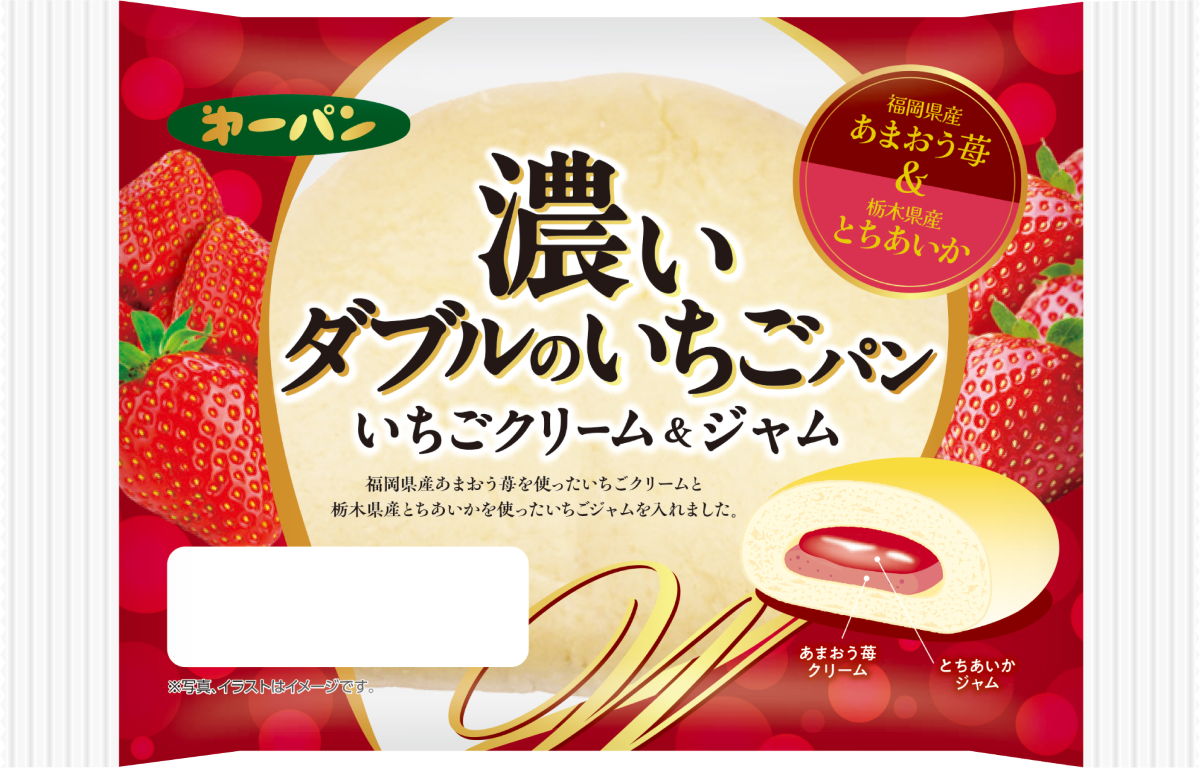 「濃いダブルのいちごパン」は、名前の通り、いちご味の濃さにこだわった商品です。パンの中には、甘酸っぱく濃厚な「あまおう」いちごクリームと、ほどよい酸味の「とちあいか」いちごジャムが入っており、濃厚ないちご味を楽しめます。