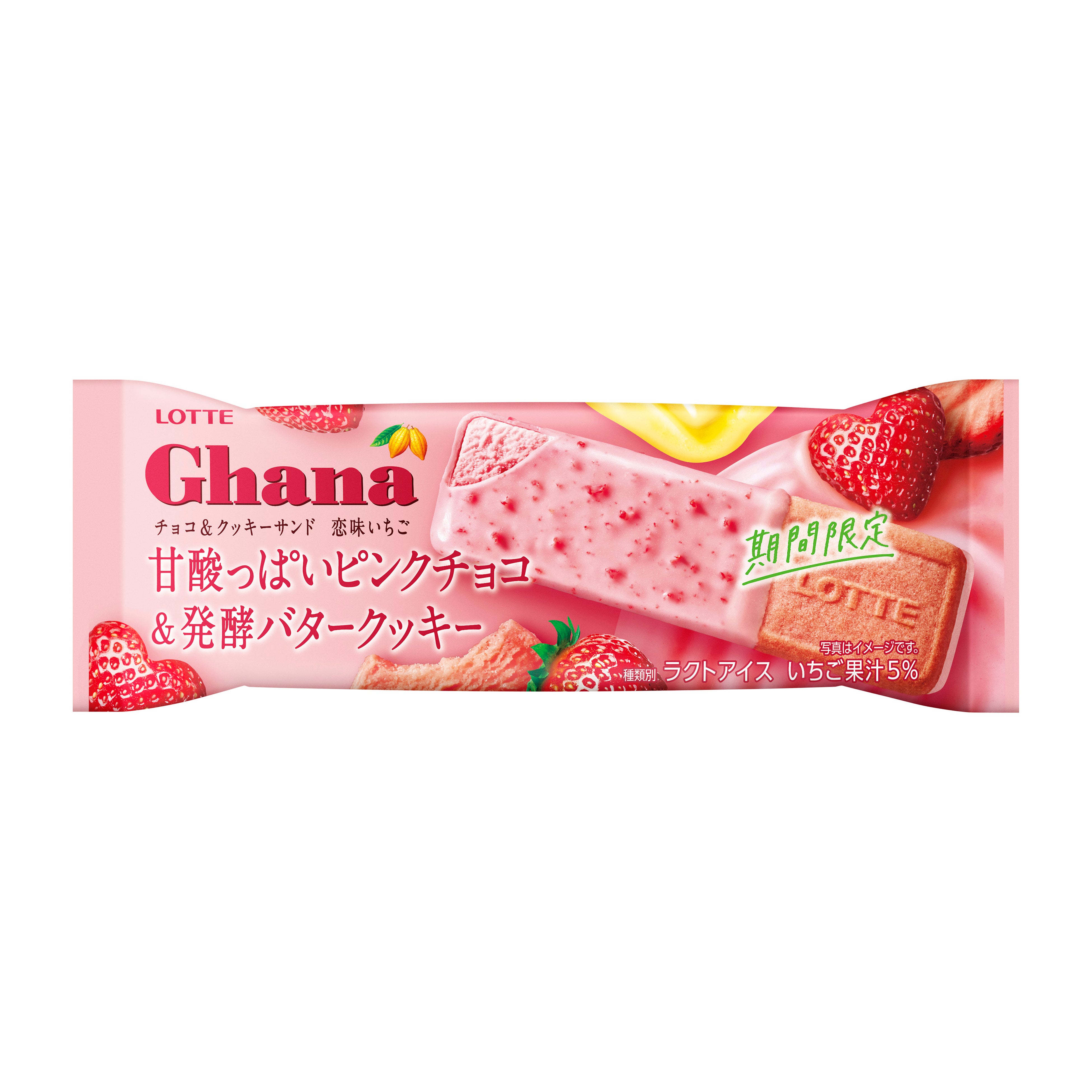 ロッテのチョコレート「ガーナ」ブランドから展開される「ガーナ アイス」。ガーナアイスシリーズから、いちご尽くしフレーバー「ガーナチョコ&クッキーサンド 恋味いちご」を1月5日(月)より発売します。パッケージはいちごをあしらったピンク色が映えるデザインで、いちごの季節をかわいらしく演出します。この時期だけの味わいをぜひお楽しみください!