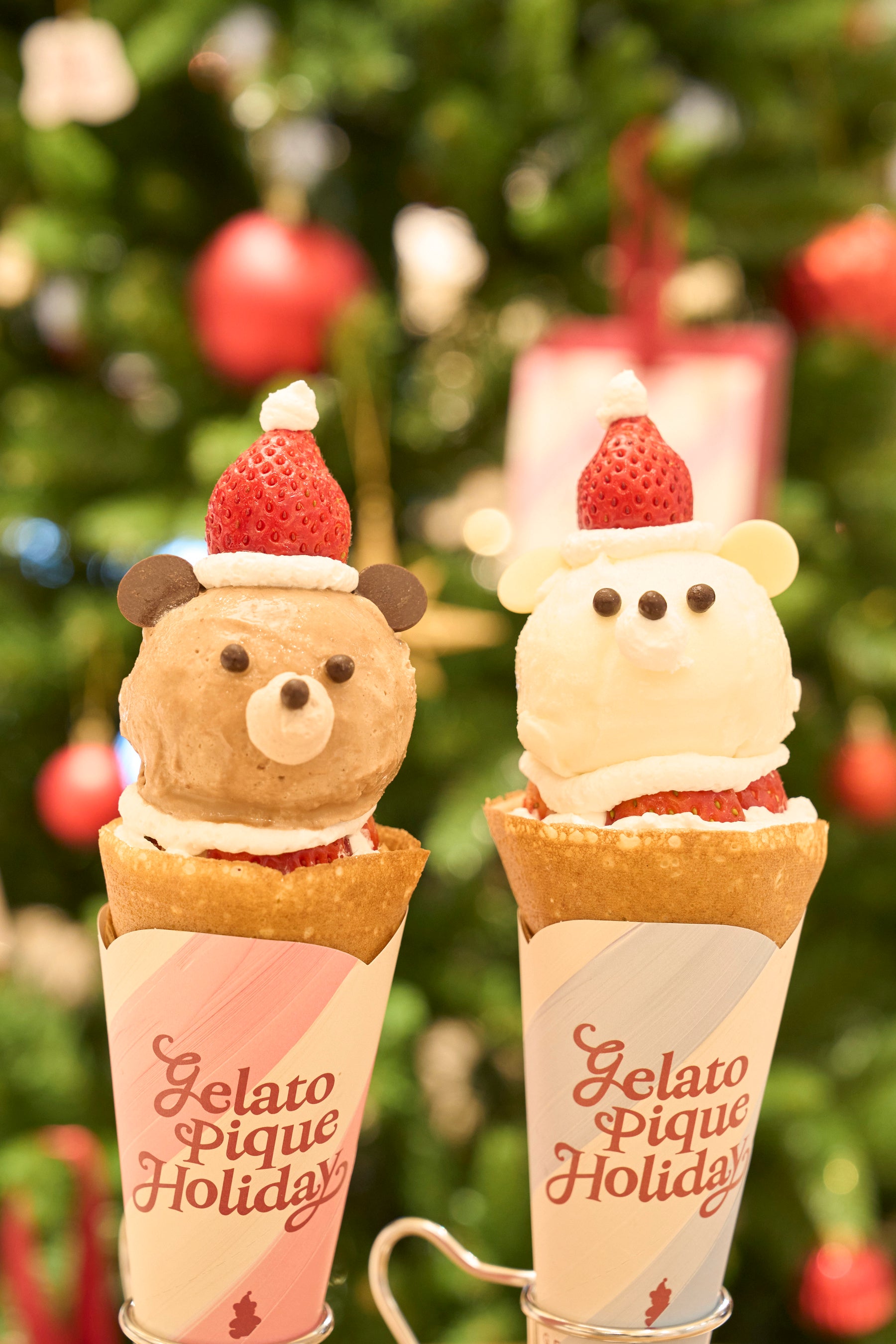 ジャージー牛乳を使用した濃厚なミルクジェラートの顔に、いちごの帽子をかぶったピケベアがのった、ホリデーシーズンクレープ。クレープの中には、北海道産マスカルポーネとクリームチーズを使用したコク深いチーズクリームと、ブリュレムース。さらに香ばしい全粒粉クッキークランブルの食感と、甘酸っぱいベリーソースを重ねました。