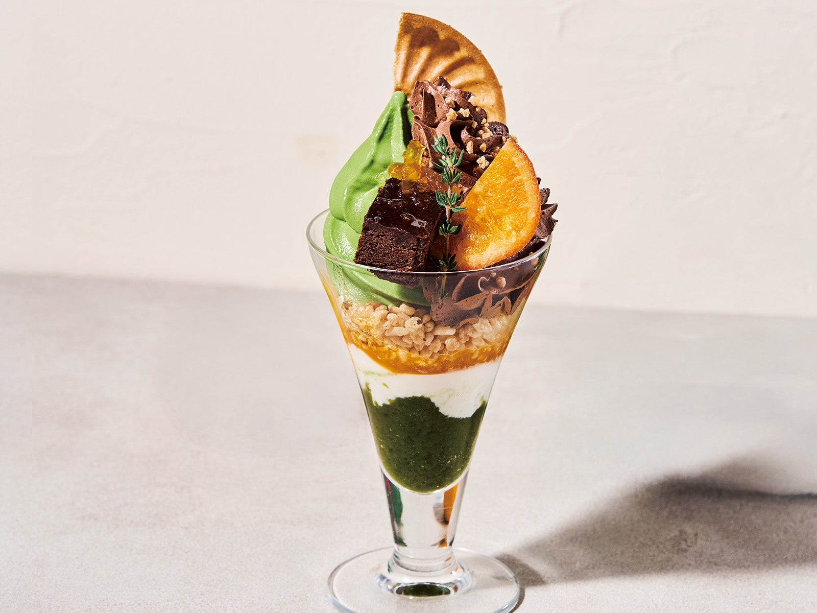風味豊かな宇治抹茶を使用した伊右衛門カフェのソフトクリームパフェ。卵や牛乳などの動物性食材を一切使用しない100%植物性のヴィーガンソイクリームもお楽しみいただけます。