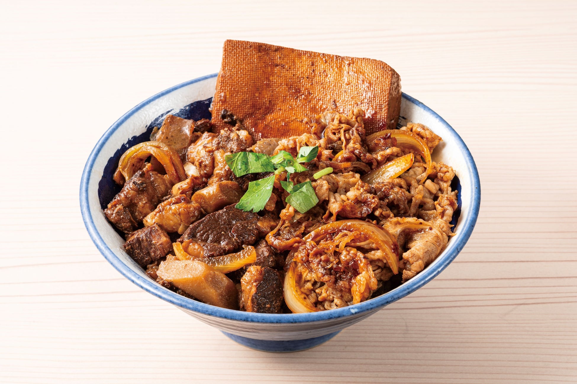 看板メニュー「肉めし」の、秘伝のかえしとこだわりの割り下で丁寧にじっくり煮込むことで、コクのある味わいに仕上げています。そこへ、牛肉の旨みと玉ねぎの甘みが際立つ牛丼の具を合わせ、二つの肉料理を一杯に豪快に盛り付けました。じっくり煮込んだ肉の深いコクと、牛丼ならではのジューシーな旨みを同時に味わえる、食べ応えのある一杯です。